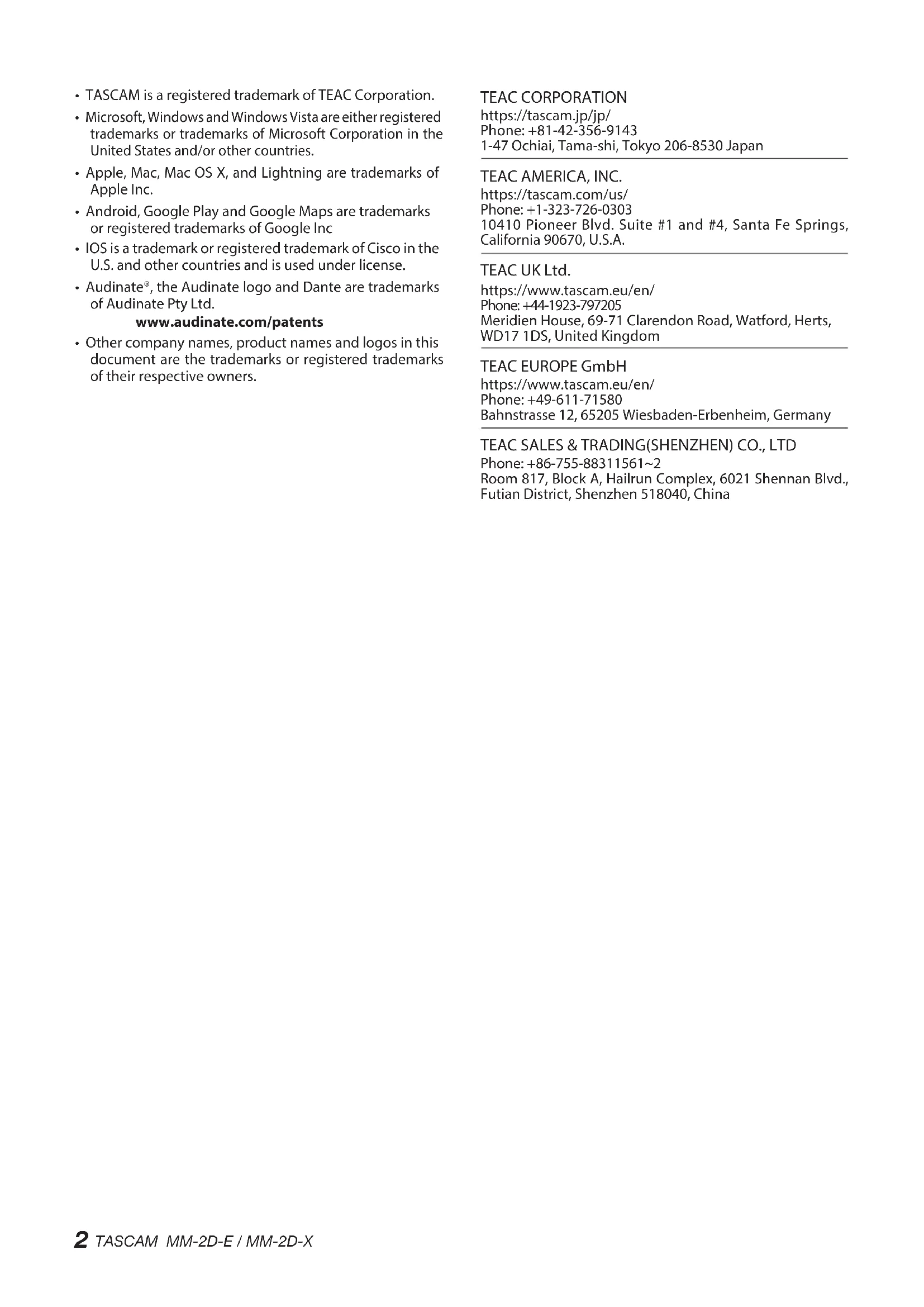 For U.S.A. Declaration of Conformity Model Number: MM-2D-E / MM-2D-XTrade Name: TASCAMResponsible party: TEAC AMERICA, INC.Address: 10410 Pioneer Blvd. Suite #1 and #4, Santa Fe Springs, California 90670, U.S.A.Telephone number: 1-323-726-0303This device complies with Part 15 of the FCC Rules. Operation is subject to the following two conditions: (1) this device may not cause harmful interference, and (2) this device must accept any interference received, including interference that may cause undesired operation.