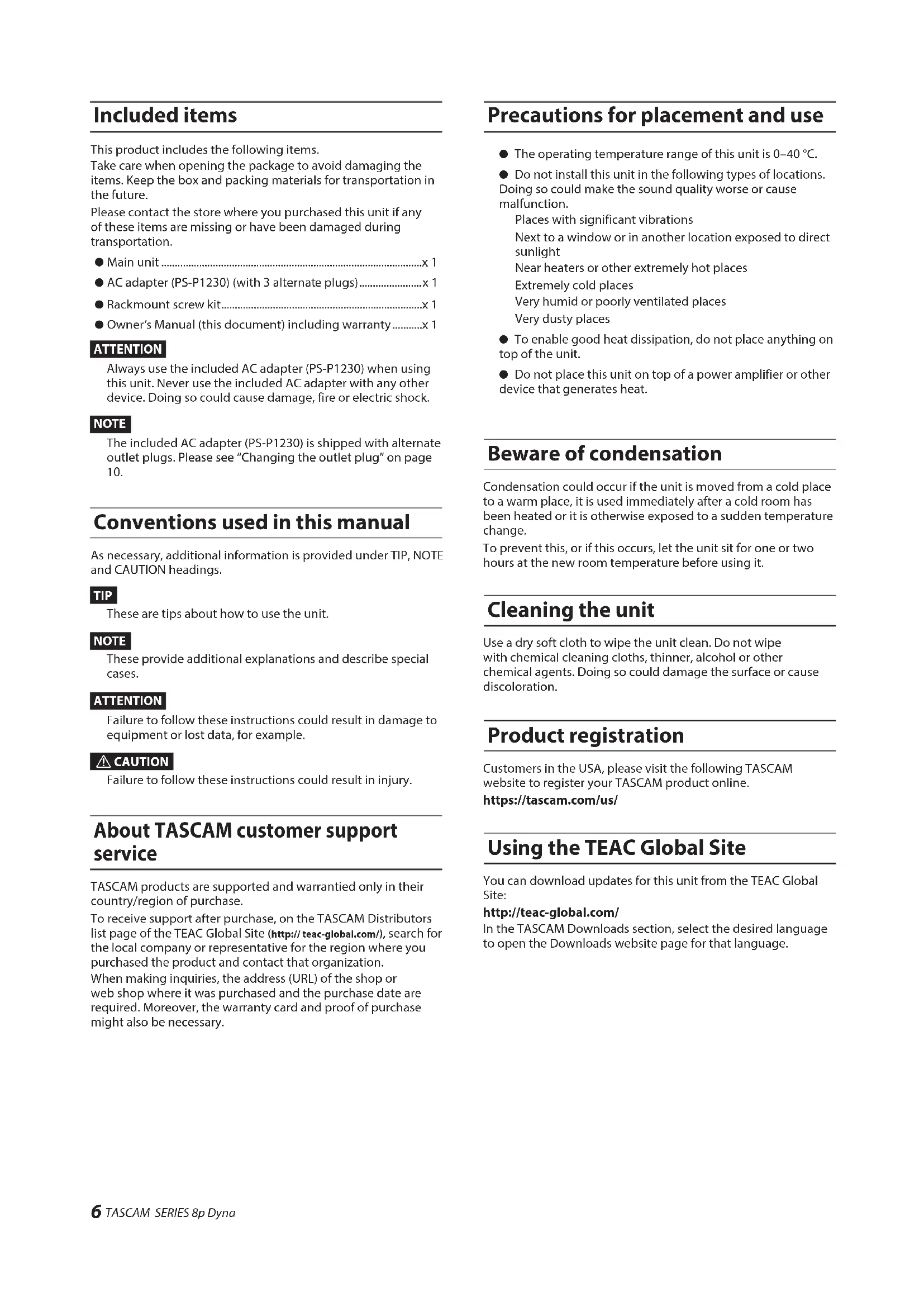 CAUTION Failure to follow these instructions could result in injury. About TASCAM customer support service TASCAM products are supported and warrantied only in their country/region of purchase. To receive support after purchase, on the TASCAM Distributors list page of the TEAC Global Site (http:// teac-global.com/), search for the local company or representative for the region where you purchased the product and contact that organization. When making inquiries, the address (URL) of the shop or web shop where it was purchased and the purchase date are required. Moreover, the warranty card and proof of purchase might also be necessary. Precautions for placement and use p The operating temperature range of this unit is 0–40 °C. p Do not install this unit in the following types of locations. Doing so could make the sound quality worse or cause malfunction. Places with significant vibrations Next to a window or in another location exposed to direct sunlight Near heaters or other extremely hot places Extremely cold places Very humid or poorly ventilated places Very dusty places p To enable good heat dissipation, do not place anything on top of the unit. p Do not place this unit on top of a power amplifier or other device that generates heat. Beware of condensation Condensation could occur if the unit is moved from a cold place to a warm place, it is used immediately after a cold room has been heated or it is otherwise exposed to a sudden temperature change. To prevent this, or if this occurs, let the unit sit for one or two hours at the new room temperature before using it. Cleaning the unit Use a dry soft cloth to wipe the unit clean. Do not wipe with chemical cleaning cloths, thinner, alcohol or other chemical agents. Doing so could damage the surface or cause discoloration. Product registration Customers in the USA, please visit the following TASCAM website to register your TASCAM product online. https://tascam.com/us/ Using the TEAC Global Site You can download updates for this unit from the TEAC Global Site: http://teac-global.com/ In the TASCAM Downloads section, select the desired language to open the Downloads website page for that language.TASCAM SERIES 8p Dyna