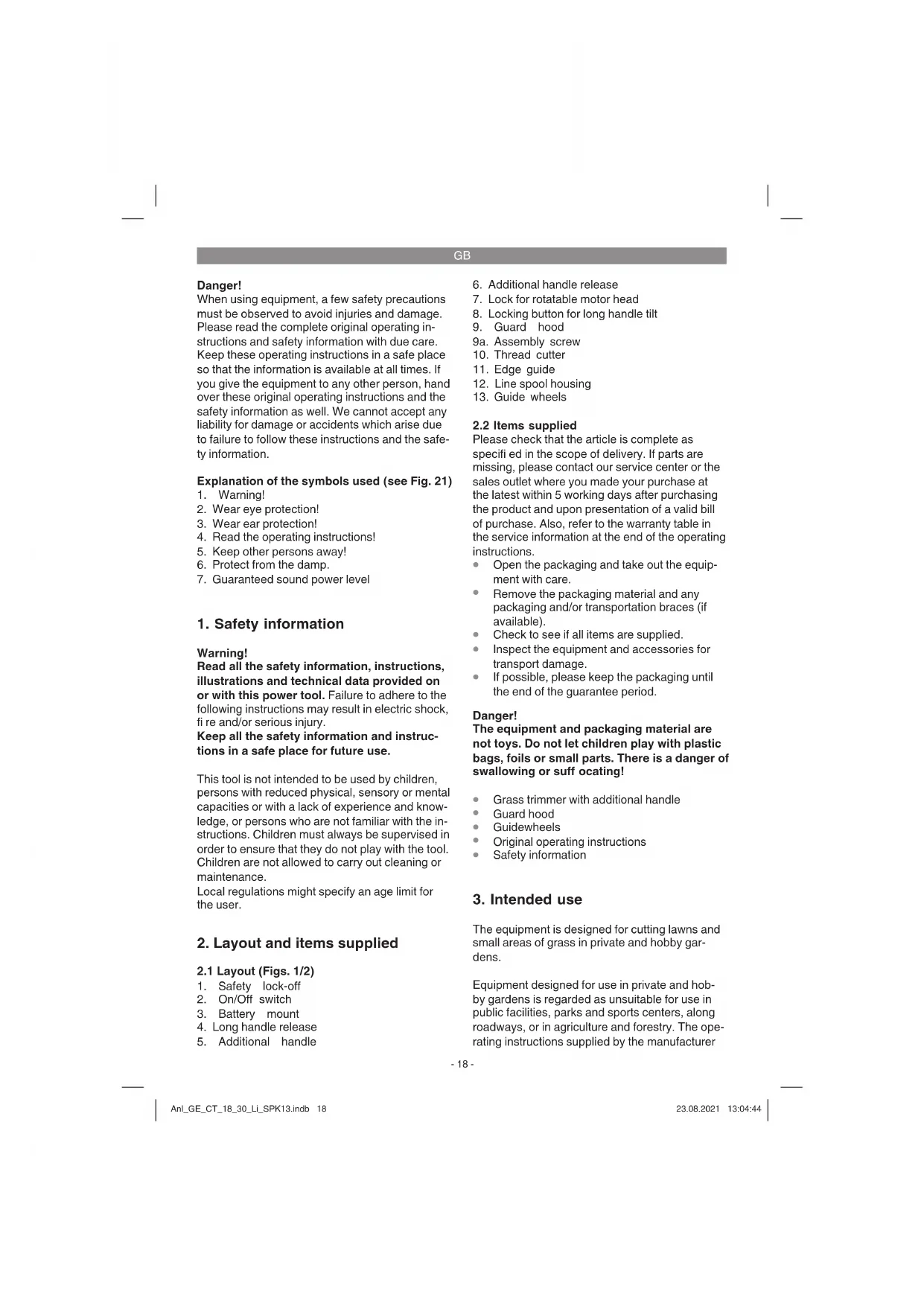 The equipment is designed for cutting lawns and small areas of grass in private and hobby gar- dens. Equipment designed for use in private and hob- by gardens is regarded as unsuitable for use in public facilities, parks and sports centers, along roadways, or in agriculture and forestry. The ope- rating instructions supplied by the manufacturer Anl_GE_CT_18_30_Li_SPK13.indb 18Anl_GE_CT_18_30_Li_SPK13.indb 18 23.08.2021 13:04:4423.08.2021 13:04:44GB