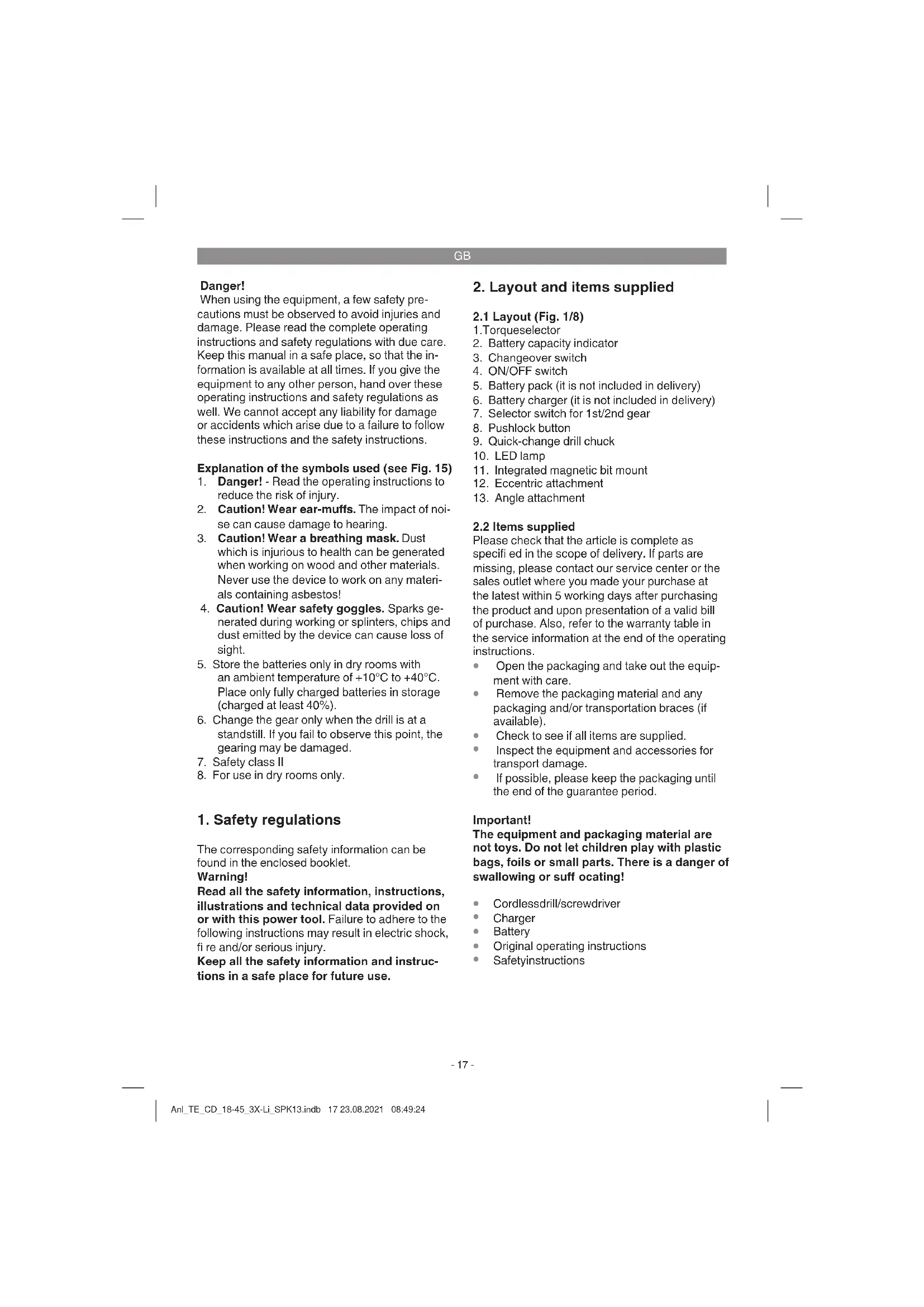 rations if the equipment is used over a pro- longed period or is not properly guided and maintained. Anl_TE_CD_18-45_3X-Li_SPK13.indb 18 23.08.2021 08:49:24GB