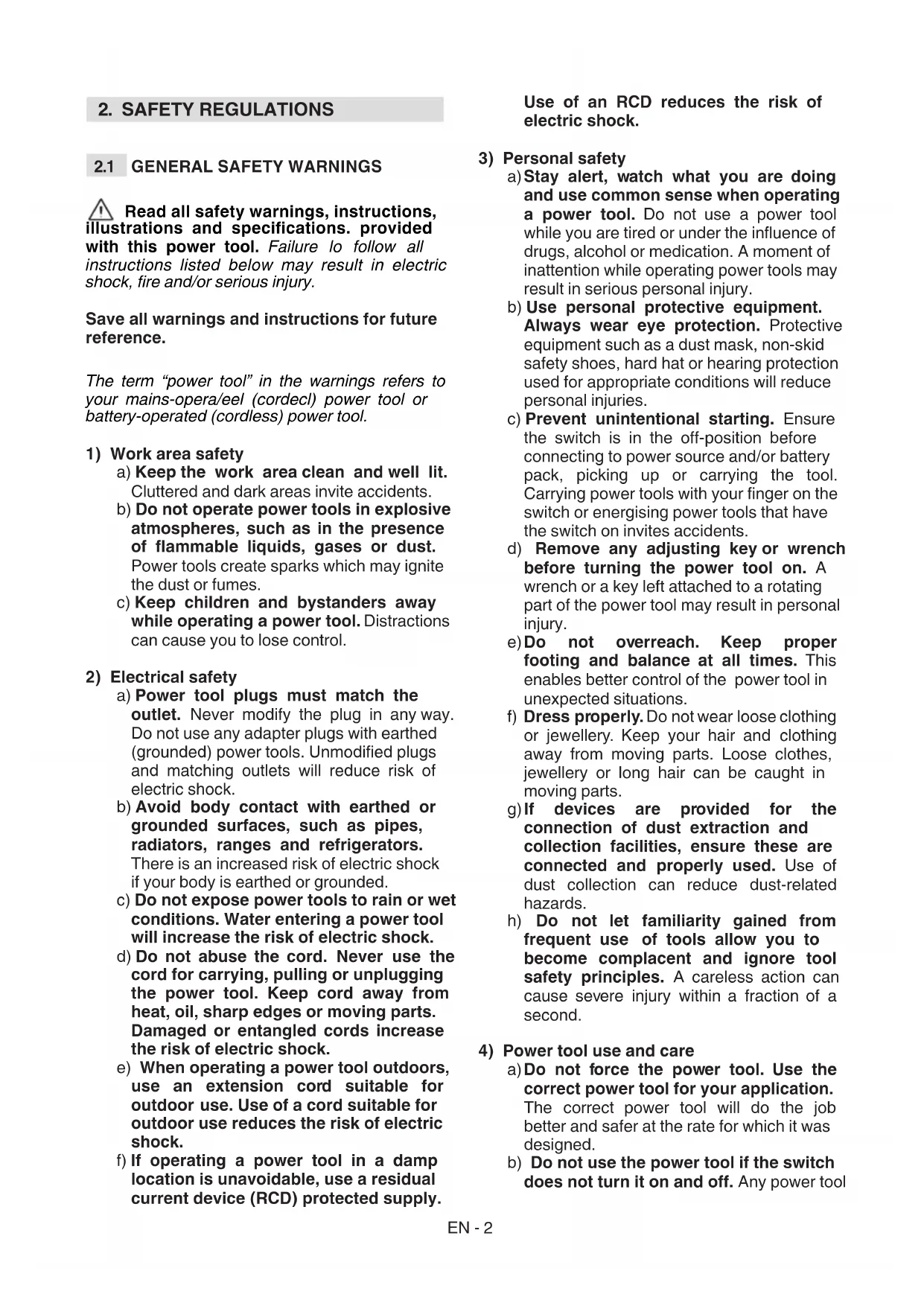 a) Do not force the power tool. Use the correct power tool for your application. The correct power tool will do the job better and safer at the rate for which it was designed. b) Do not use the power tool if the switch does not turn it on and o. Any power toolEN - 3 that cannot be controlled with the switch is dangerous and must be repaired. c) Disconnect the plug from the power source and/or remove the battery pack, if detachable, from the power tool before making any adjustments, changing accessories, or storing power tools. Such preventive safety measures reduce the risk of starting the power tool accidentally. d) Store idle power tools out of the reach of children and do not allow persons unfamiliar with the power tool or these instructions to operate the power tool. Power tools are dangerous in the hands of untrained users. e) Maintain power tools and accessories. Check for misalignment or binding of moving parts, breakage of parts and any other condition that may aect the power tool’s operation. If damaged, have the power tool repaired before use. Many accidents are caused by poorly maintained power tools. f) Keep cutting tools sharp and clean. Properly maintained cutting tools with sharp cutting edges are less likely to bind and are easier to control. g) Use the power tool, accessories and tool bits etc. in accordance with these instructions, taking into account the working conditions and the work to be performed. Use of the power tool for operations dierent from those intended could result in a hazardous situation. h) Keep handles and grasping surfaces dry, clean and free from oil and grease. Slippery handles and grasping surfaces do not allow for safe handling and control of the tool in unexpected situations.