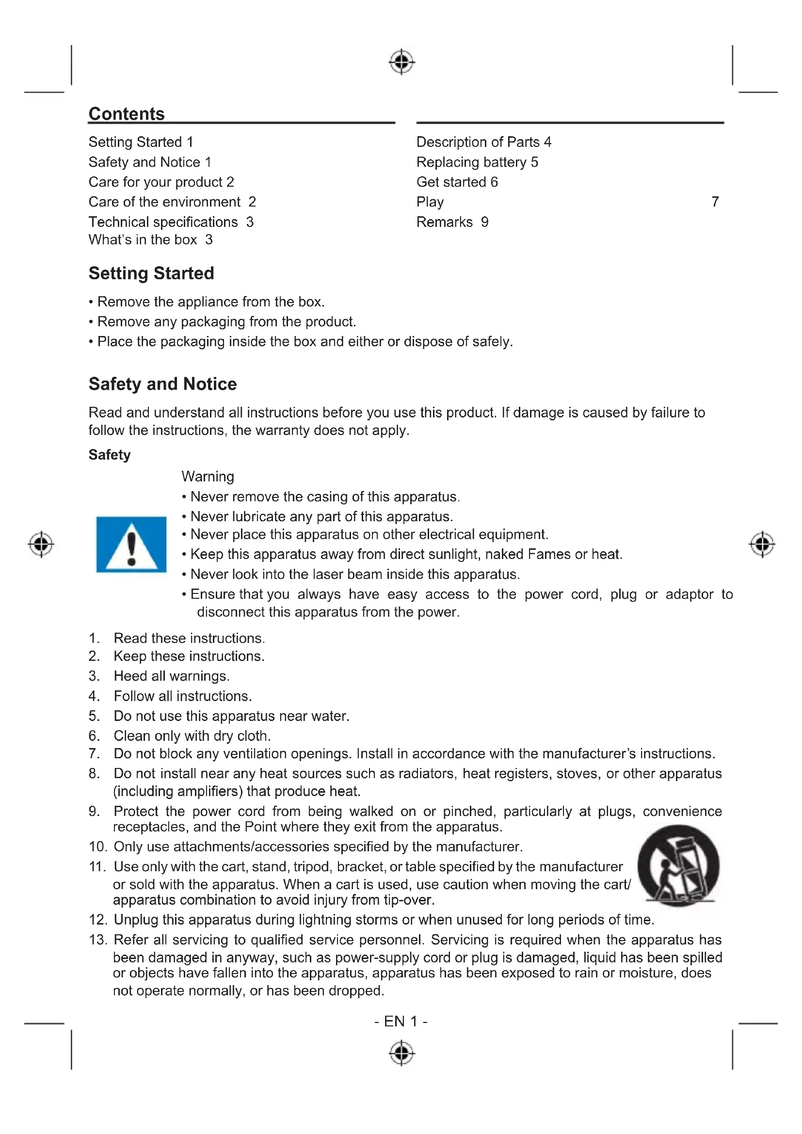 been damaged in anyway, such as power-supply cord or plug is damaged, liquid has been spilled or objects have fallen into the apparatus, apparatus has been exposed to rain or moisture, does not operate normally, or has been dropped.- EN 2 -