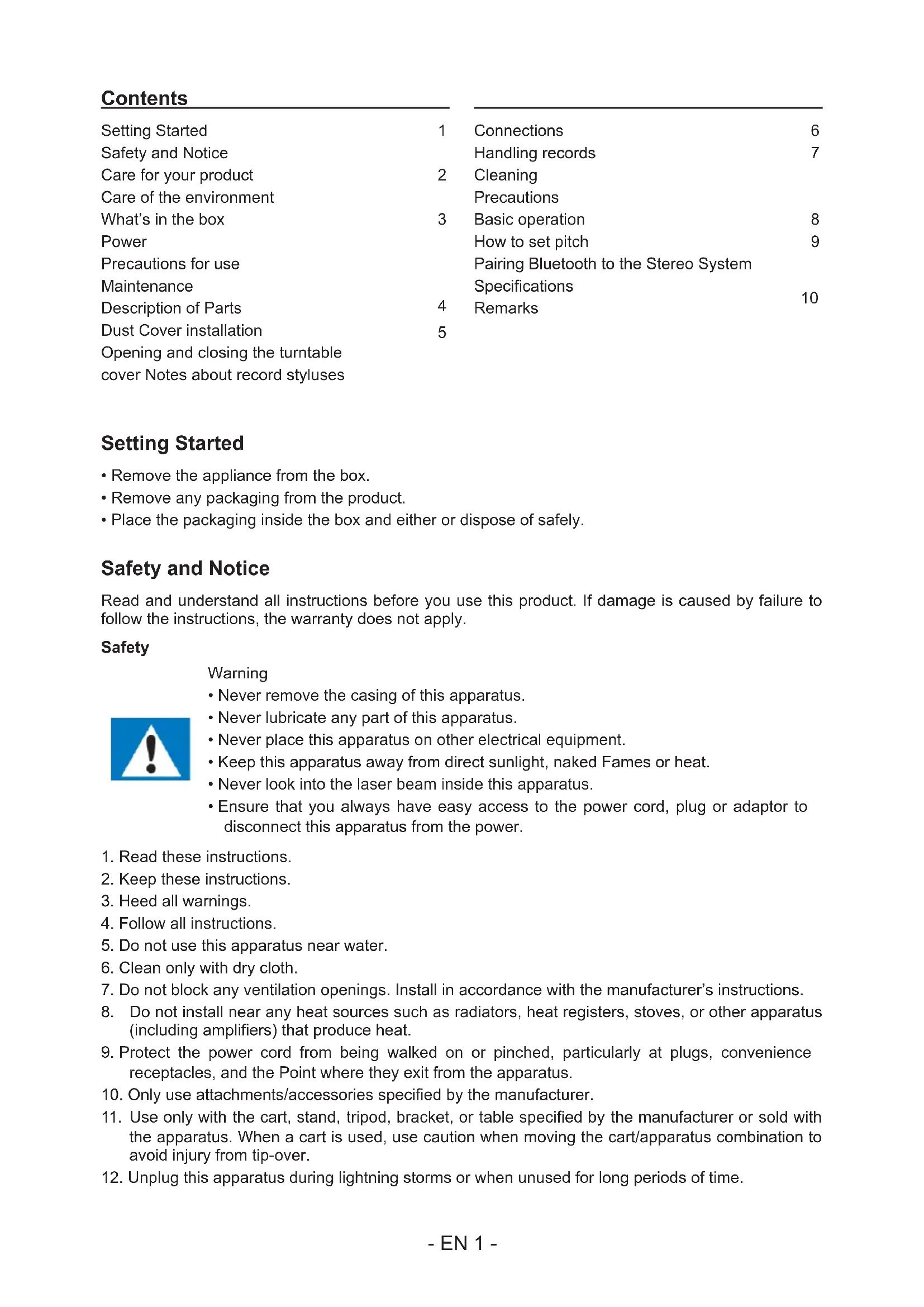 Setting Started Safety and Notice Care for your product Care of the environment What’s in the box Power Precautions for use Maintenance Description of Parts Dust Cover installation Opening and closing the turntable cover Notes about record styluses