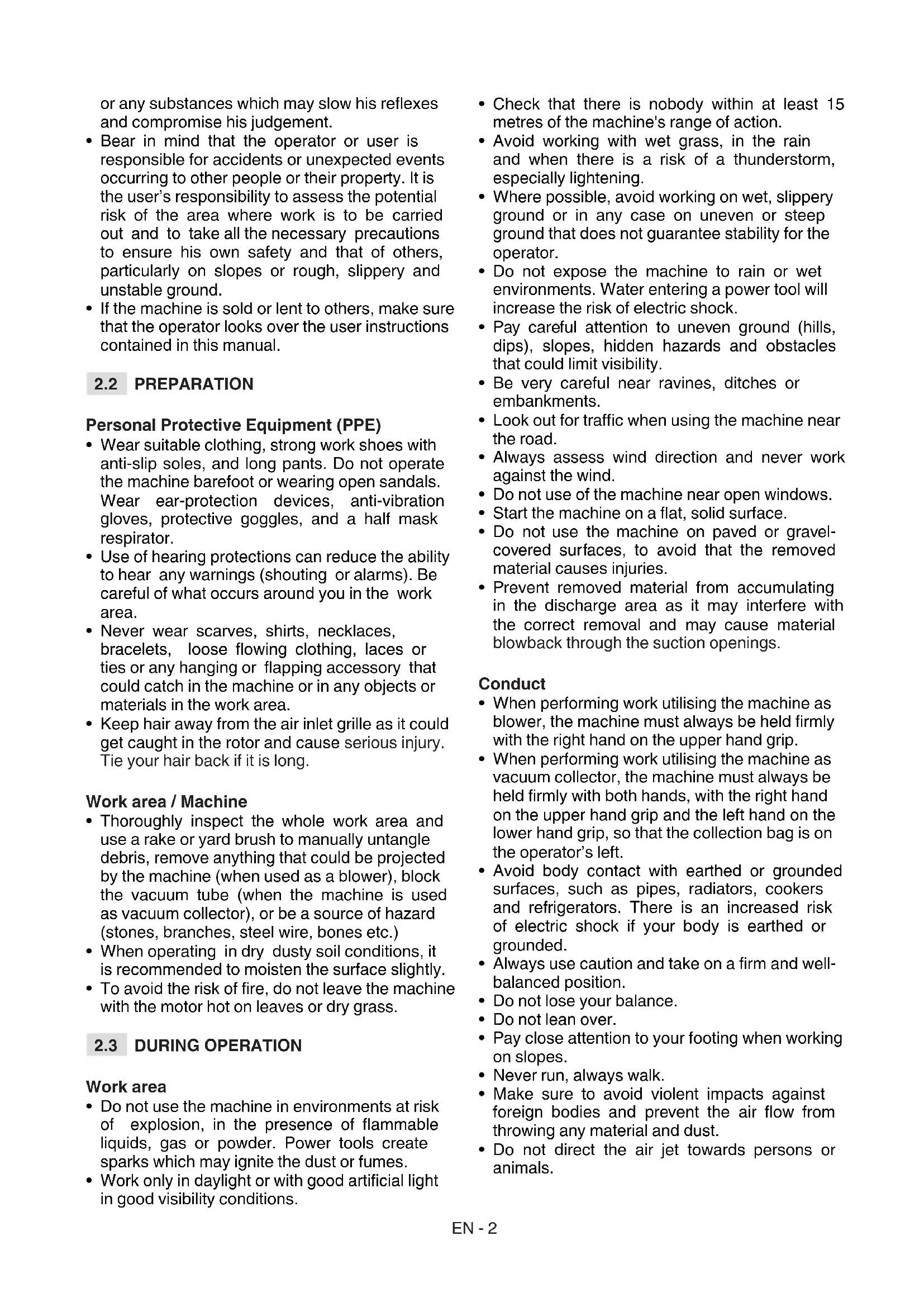 - Bear in mind that the operator or user is responsible for accidents or unexpected events occurring to other people or their property. It is the user’s responsibility to assess the potential risk of the area where work is to be carried out and to take all the necessary precautions to ensure his own safety and that of others, particularly on slopes or rough, slippery and unstable ground.