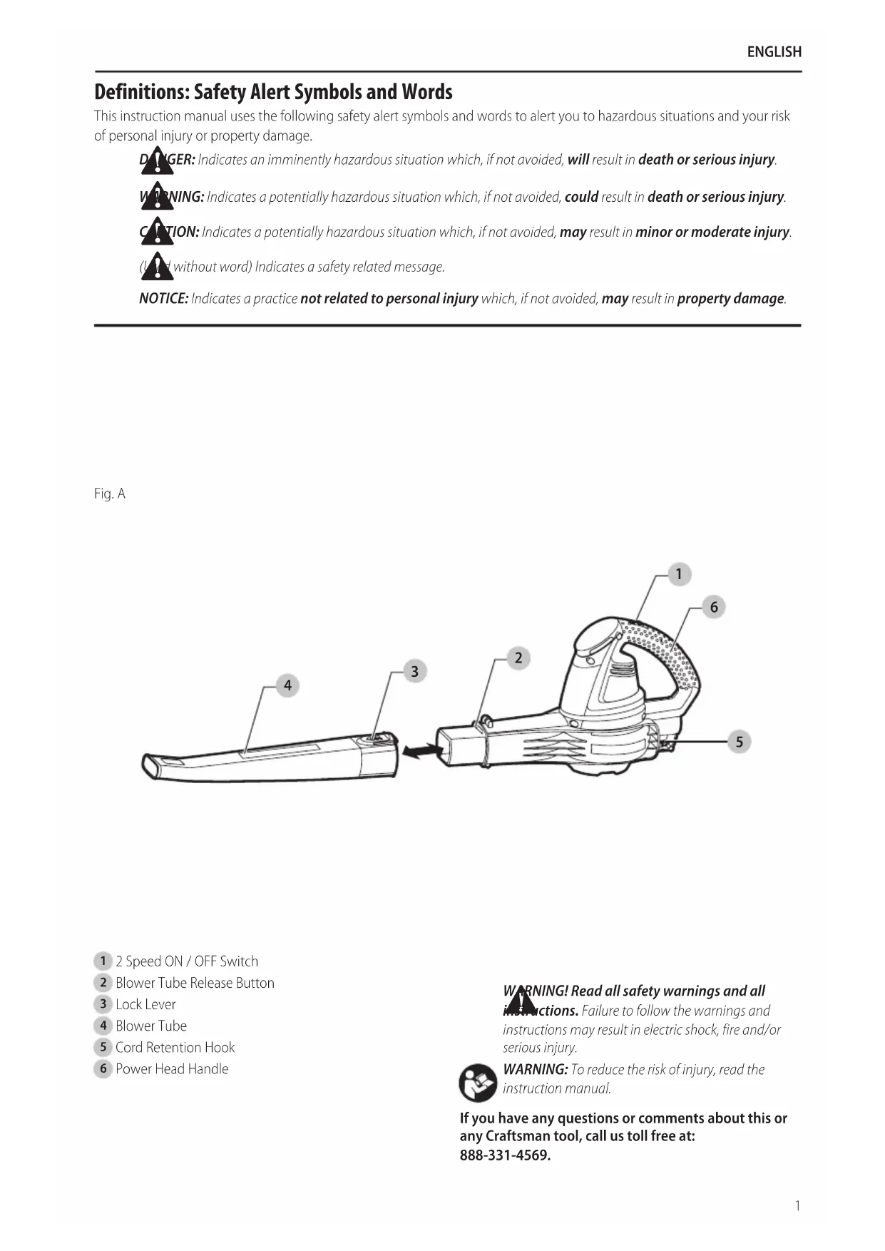 - DO NOT attempt to repair the blower. To assure product safety and reliability, repairs, maintenance, and adjustments should be performed by Craftsman service centers or authorized service centers, always using Craftsman replacementparts.