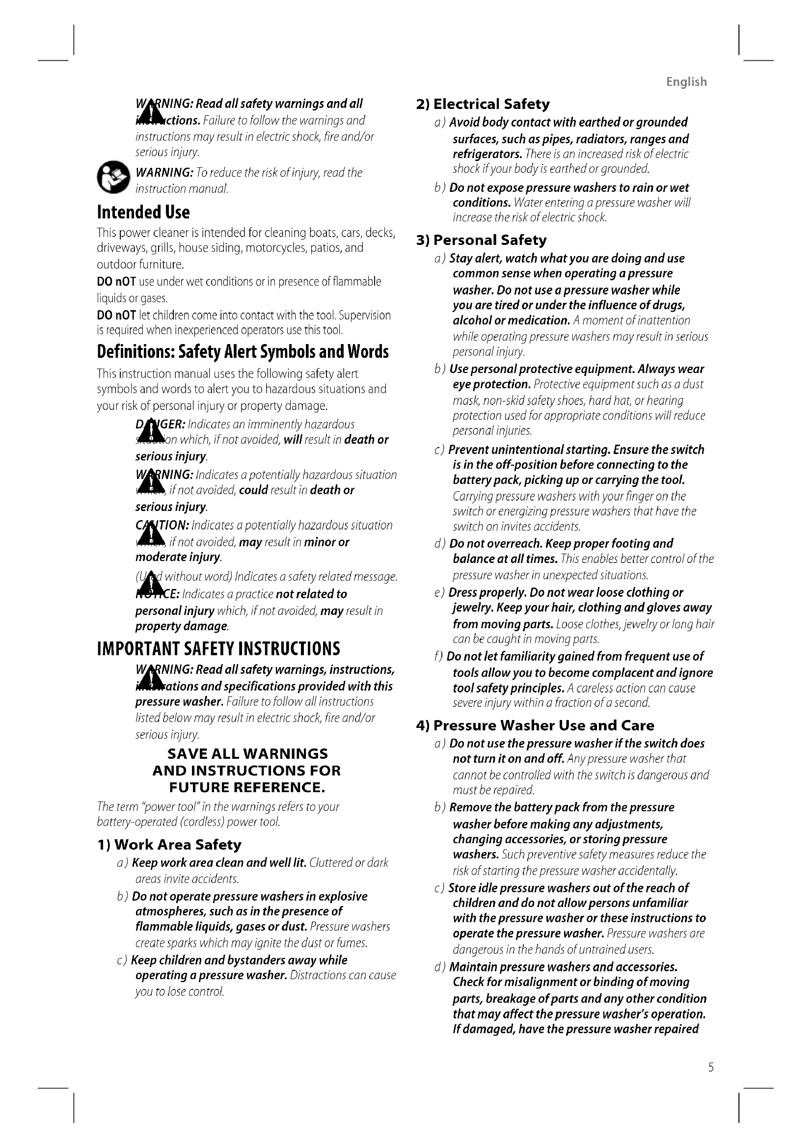 a ) Keep work area clean and well lit. Cluttered or dark areas inviteaccidents. b ) Do not operate pressure washers in explosive atmospheres, such as in the presence of flammable liquids, gases or dust. Pressure washers create sparks which may ignite the dust orfumes. c ) Keep children and bystanders away while operating a pressure washer. Distractions can cause you to losecontrol. Definitions: Safety Alert Symbols andWords This instruction manual uses the following safety alert symbols and words to alert you to hazardous situations and your risk of personal injury or propertydamage.
