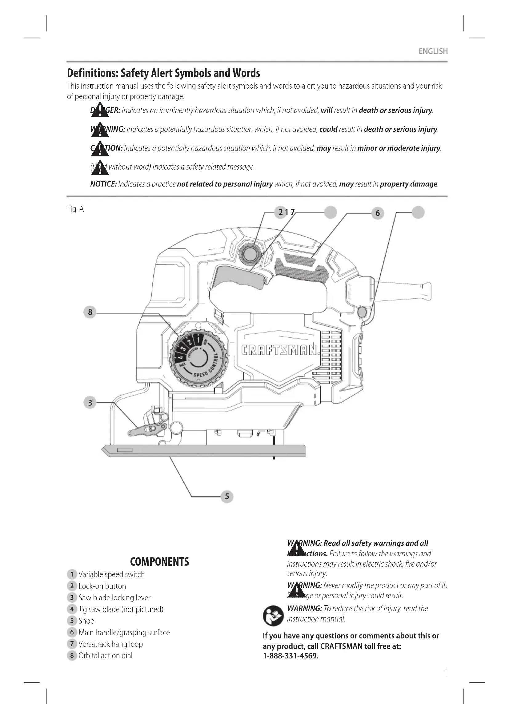 instructionmanual. If you have any questions or comments about this or any product, call CRAFTSMAN toll free at: 1-888-331-4569. Definitions: Safety Alert Symbols and Words This instruction manual uses the following safety alert symbols and words to alert you to hazardous situations and your risk of personal injury or property damage.