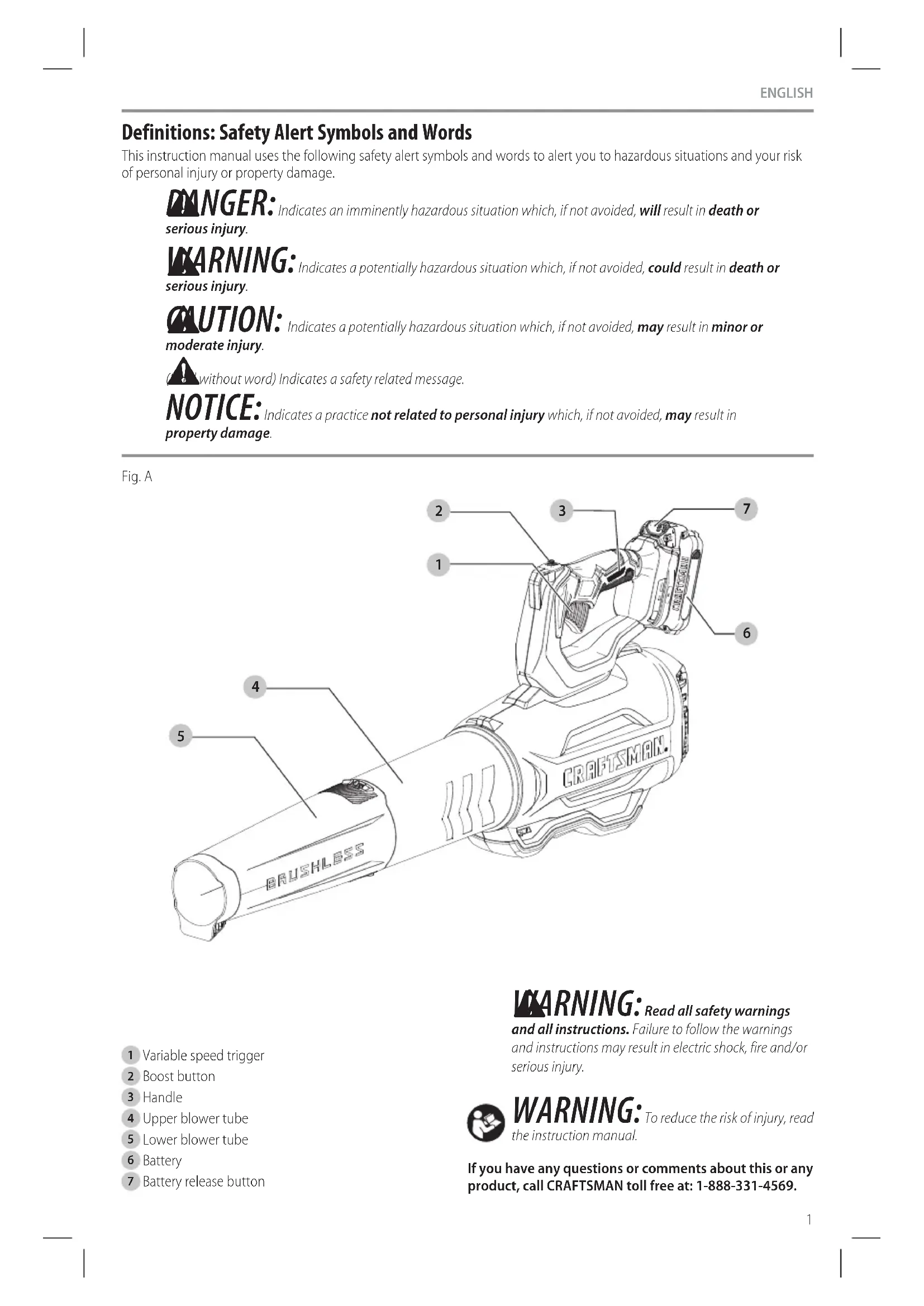 If you are not completely satisfied with the performance of your CRAFTSMAN Power Tool or Nailer for any reason, you can return it within 90 days from the date of purchase with a receipt for a full refund – no questionsasked. LATIN AMERICA: This warranty does not apply to products sold in Latin America. For products sold in Latin America, see country specific warranty information contained in the packaging, call the local company or see website for warrantyinformation. FREE WARNING LABEL REPLACEMENT: If your warning labels become illegible or are missing, call 1-888-331-4569 for a freereplacement. Three Year Limited Warranty CRAFTSMAN will repair or replace, without charge, any defects due to faulty materials or workmanship for three years from the date of purchase (two years for batteries). This warranty does not cover part failure due to normal wear or tool abuse. For further detail of warranty coverage and warranty repair information, visit www.craftsman.com or call 1-888-331-4569. This warranty does not apply to accessories or damage caused where repairs have been made or attempted by others. THIS LIMITED WARRANTY IS GIVEN IN LIEU OF ALL OTHERS, INCLUDING THE IMPLIED WARRANTY OF MERCHANTABILITY AND FITNESS FOR A