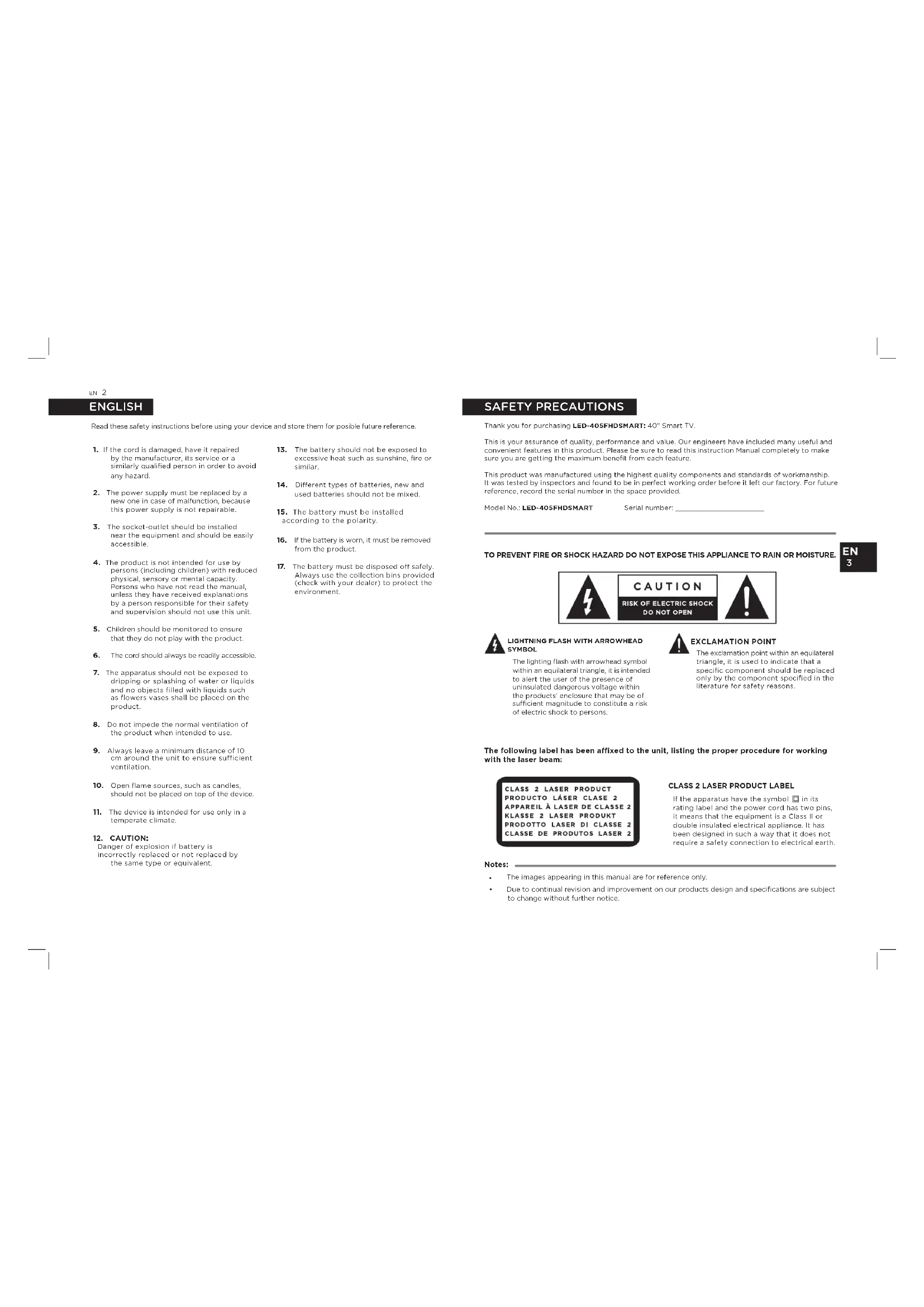 Read these safety instructions before using your device and store them for posible future reference.Thank you for purchasing LED-405FHDSMART: 40” Smart TV. This is your assurance of quality, performance and value. Our engineers have included many useful and convenient features in this product. Please be sure to read this instruction Manual completely to make sure you are getting the maximum benefit from each feature. This product was manufactured using the highest quality components and standards of workmanship. It was tested by inspectors and found to be in perfect working order before it left our factory. For future reference, record the serial number in the space provided. Model No.: LED-405FHDSMART Serial number: ___________________ TO PREVENT FIRE OR SHOCK HAZARD DO NOT EXPOSE THIS APPLIANCE TO RAIN OR MOISTURE. LIGHTNING FLASH WITH ARROWHEAD SYMBOL The lighting flash with arrowhead symbol within an equilateral triangle, it is intended to alert the user of the presence of uninsulated dangerous voltage within the products’ enclosure that may be of sucient magnitude to constitute a risk of electric shock to persons. EXCLAMATION POINT The exclamation point within an equilateral triangle, it is used to indicate that a specific component should be replaced only by the component specified in the literature for safety reasons.