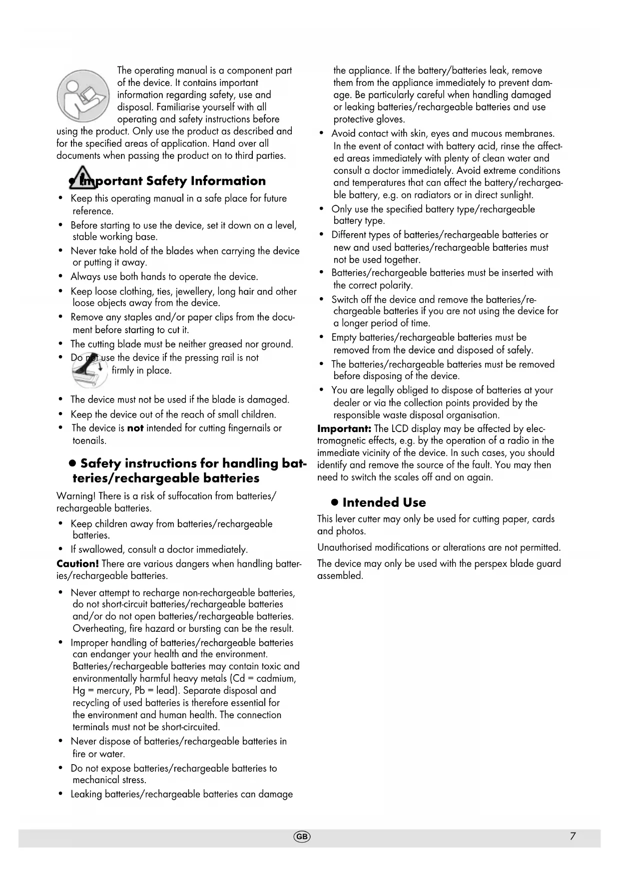 - You are legally obliged to dispose of batteries at your dealer or via the collection points provided by the responsible waste disposal organisation. Important: The LCD display may be aected by elec- tromagnetic eects, e.g. by the operation of a radio in the immediate vicinity of the device. In such cases, you should identify and remove the source of the fault. You may then need to switch the scales o and on again. ▯ Intended Use This lever cutter may only be used for cutting paper, cards and photos. Unauthorised modications or alterations are not permitted. The device may only be used with the perspex blade guard assembled.8