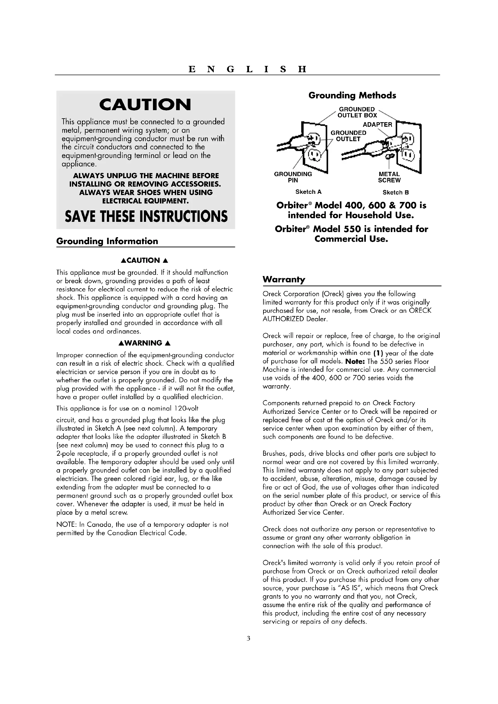 Model 400, 600 & 700 is intended for Household Use. Orbiter