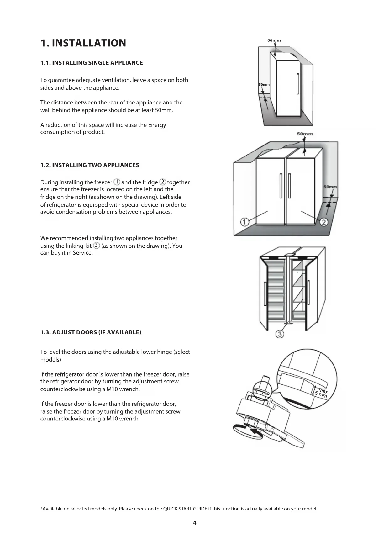 (as shown on the drawing). You can buy it in Service. 1.3. ADJUST DOORS (IF AVAILABLE) To level the doors using the adjustable lower hinge (select models) If the refrigerator door is lower than the freezer door, raise the refrigerator door by turning the adjustment screw counterclockwise using a M10 wrench. If the freezer door is lower than the refrigerator door, raise the freezer door by turning the adjustment screw counterclockwise using a M10 wrench. *Available on selected models only. Please check on the QUICK START GUIDE if this function is actually available on your model. 50mm 50mm 5 mm max5