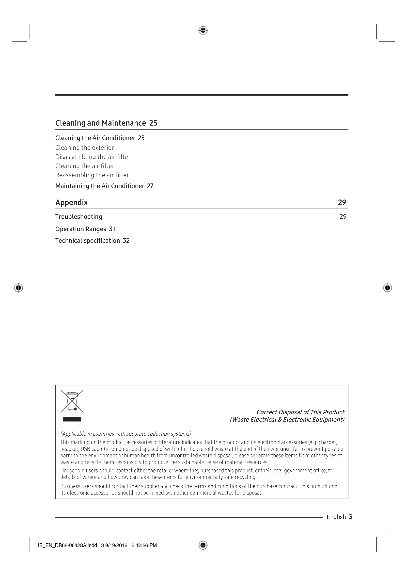 Troubleshooting 29 Operation Ranges 31 Technical specification 32 Correct Disposal of This Product (Waste Electrical & Electronic Equipment) (Applicable in countries with separate collection systems) This marking on the product, accessories or literature indicates that the product and its electronic accessories (e.g. charger, headset, USB cable) should not be disposed of with other household waste at the end of their working life. To prevent possible harm to the environment or human health from uncontrolled waste disposal, please separate these items from other types of waste and recycle them responsibly to promote the sustainable reuse of material resources. Household users should contact either the retailer where they purchased this product, or their local government office, for details of where and how they can take these items for environmentally safe recycling. Business users should contact their supplier and check the terms and conditions of the purchase contract. This product and its electronic accessories should not be mixed with other commercial wastes for disposal.IB_EN_DB68-06428A.indd 3 9/19/2016 2:12:56 PM4 EnglishSafety Information Safety Information Before using your new air conditioner, please read this manual thoroughly to ensure that you know how to safely and efficiently operate the extensive features and functions of your new appliance. Because the following operating instructions cover various models, the characteristics of your air conditioner may differ slightly from those described in this manual. If you have any questions, call your nearest contact centre or find help and information online at www.samsung.com. WARNING Hazards or unsafe practices that may result in severe personal injury or death. CAUTION Hazards or unsafe practices that may result in minor personal injury or property damage. Follow directions. Do NOT attempt. Make sure the machine is grounded to prevent electric shock. Cut off the power supply. Do NOT disassemble. FOR INSTALLATION WARNING Use the power line with the power specifications of the product or higher and use the power line for this appliance only. In addition, do not use an extension line.