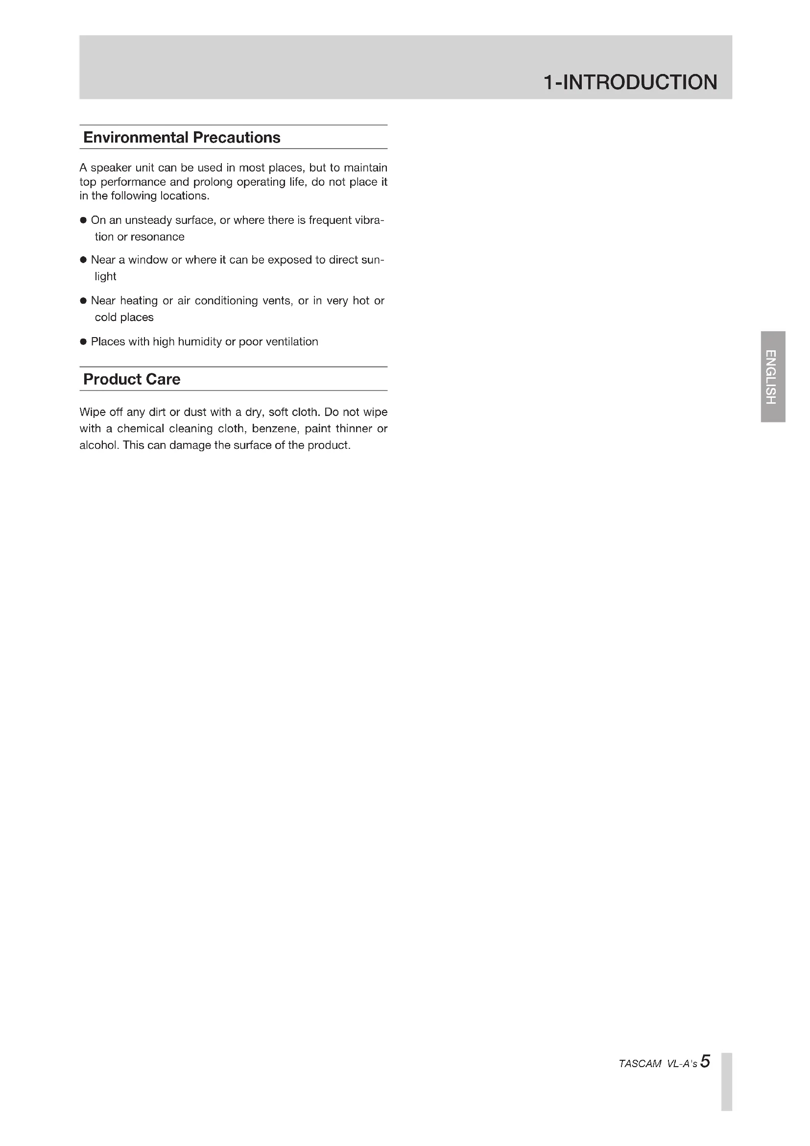 ENGLISH 1-INTRODUCTION Environmental Precautions A speaker unit can be used in most places, but to maintaintop performance and prolong operating life, do not place itin the following locations.– On an unsteady surface, or where there is frequent vibra-tion or resonance– Near a window or where it can be exposed to direct sun-light– Near heating or air conditioning vents, or in very hot orcold places– Places with high humidity or poor ventilation Product Care Wipe off any dirt or dust with a dry, soft cloth. Do not wipewith a chemical cleaning cloth, benzene, paint thinner oralcohol. This can damage the surface of the product.6 TASCAM VL-A's