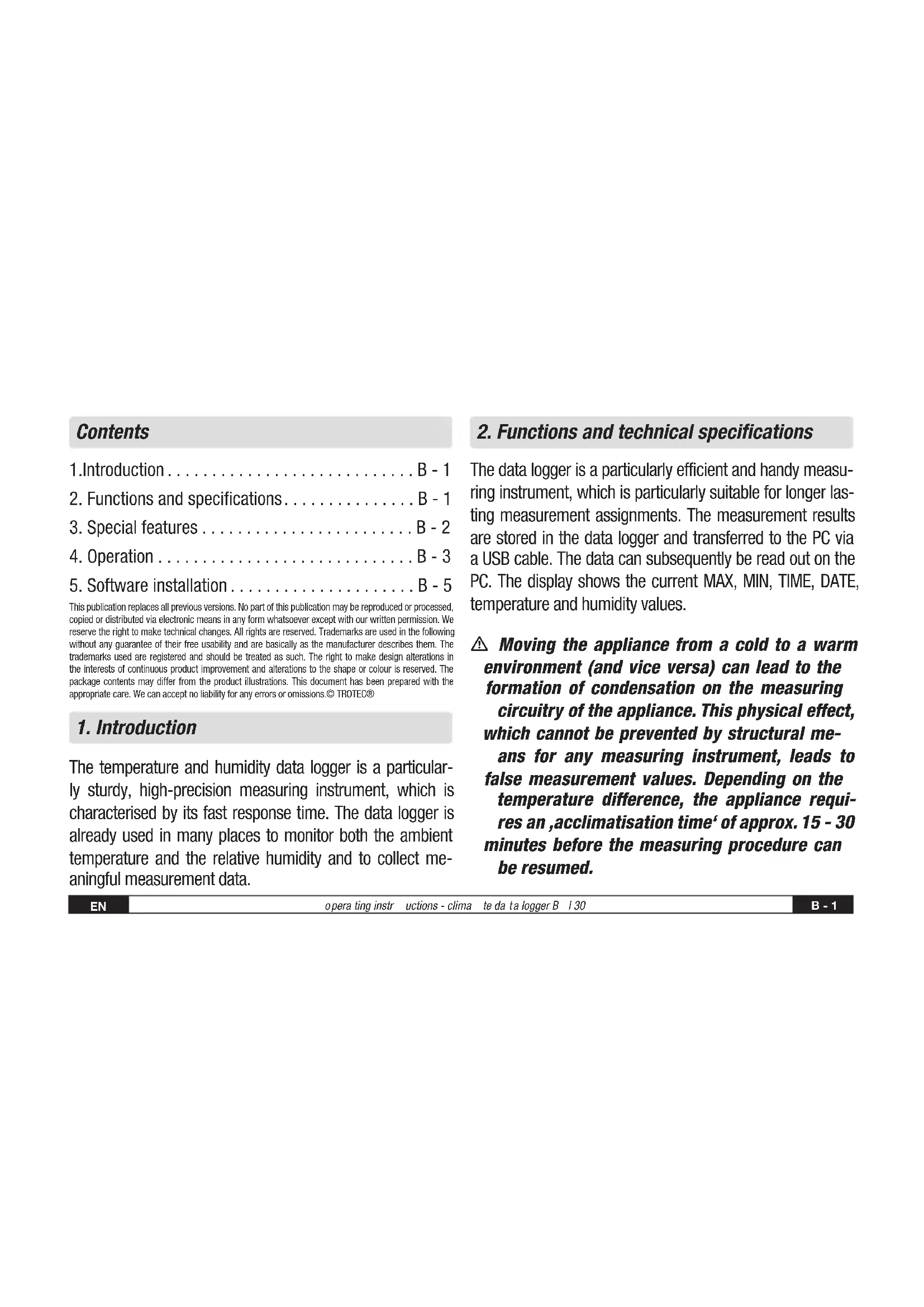 The data logger is a particularly efficient and handy measu- ring instrument, which is particularly suitable for longer las- ting measurement assignments. The measurement results are stored in the data logger and transferred to the PC via a USB cable. The data can subsequently be read out on the PC. The display shows the current MAX, MIN, TIME, DATE, temperature and humidity values. m Moving the appliance from a cold to a warm environment (and vice versa) can lead to the formation of condensation on the measuring circuitry of the appliance. This physical effect, which cannot be prevented by structural me- ans for any measuring instrument, leads to false measurement values. Depending on the temperature difference, the appliance requi- res an ‚acclimatisation time‘ of approx. 15 - 30 minutes before the measuring procedure can be resumed. TRO-TR-BA-BL30-HS-002-INT - Kopie.indd 1 08.09.2014 10:19:11B - 2 opera ting instr uctions - clima te da t a logger B l 30 EN m Make sure that the data logger is always used/ stored in an upright position. This also applies after measurements taken at low temperatures or in highly humid environments. The intention is to avoid any condensation that forms collec- ting in the appliance; instead, it can escape from the lower part of the appliance. Wait until any moisture which may have formed inside the appliance due to physical processes has completely evaporated before the collected data are read out for evaluation. In order to preserve the batteries, the data logger can also be directly connected to the PC via USB. When connected in this manner it draws its power directly from the PC.