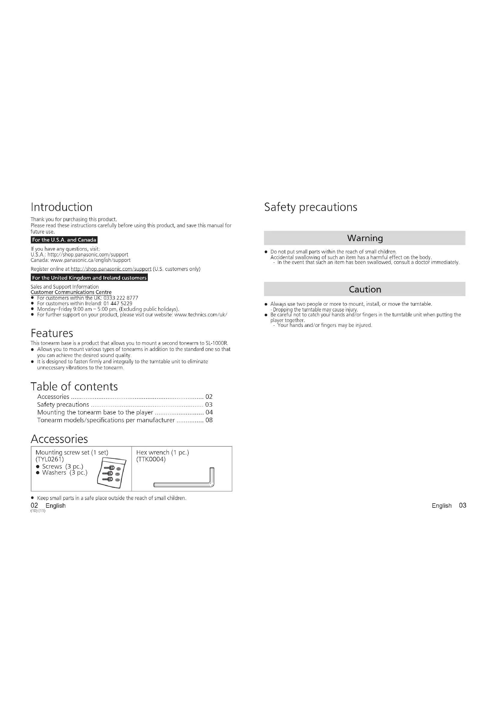 It is designed to fasten firmly and integrally to the turntable unit to eliminate unnecessary vibrations to the tonearm. Safety precautions Accessories Mounting screw set (1 set) (TYL0261)