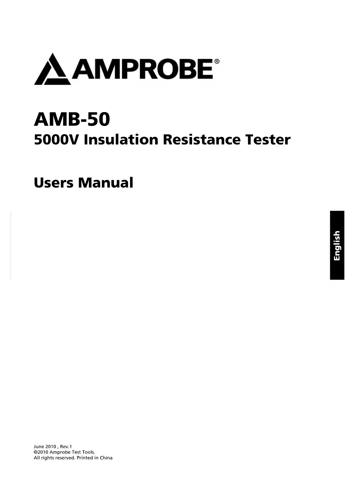 - Manual de usoAMB-50 5000V Insulation Resistance Tester Users Manual June 2010 , Rev.1 ©2010 Amprobe Test Tools. All rights reserved. Printed in China EnglishLimited Warranty and Limitation of Liability Your Amprobe product will be free from defects in material and workmanship for 1 year from the date of purchase. This warranty does not cover fuses, disposable batteries or damage from accident, neglect, misuse, alteration, contamination, or abnormal conditions of operation or handling. Resellers are not authorized to extend any other warranty on Amprobe’s behalf. To obtain service during the warranty period, return the product with proof of purchase to an authorized Amprobe Test Tools Service Center or to an Amprobe dealer or distributor. See Repair Section for details. THIS WARRANTY IS YOUR ONLY REMEDY. ALL OTHER WARRANTIES - WHETHER EXPRESS, IMPLIED OR STAUTORY - INCLUDING IMPLIED WARRANTIES OF FITNESS FOR A PARTICULAR PURPOSE OR MERCHANTABILITY, ARE HEREBY DISCLAIMED. MANUFACTURER SHALL NOT BE LIABLE FOR ANY SPECIAL, INDIRECT, INCIDENTAL OR CONSEQUENTIAL DAMAGES OR LOSSES, ARISING FROM ANY CAUSE OR THEORY. Since some states or countries do not allow the exclusion or limitation of an implied warranty or of incidental or consequential damages, this limitation of liability may not apply to you. Repair All test tools returned for warranty or non-warranty repair or for calibration should be accompanied by the following: your name, company’s name, address, telephone number, and proof of purchase. Additionally, please include a brief description of the problem or the service requested and include the test leads with the meter. Non-warranty repair or replacement charges should be remitted in the form of a check, a money order, credit card with expiration date, or a purchase order made payable to Amprobe® Test Tools. In-Warranty Repairs and Replacement – All Countries Please read the warranty statement and check your battery before requesting repair. During the warranty period any defective test tool can be returned to your Amprobe® Test Tools distributor for an exchange for the same or like product. Please check the “Where to Buy” section on www.amprobe.com for a list of distributors near you. Additionally, in the United States and Canada In-Warranty repair and replacement units can also be sent to a Amprobe® Test Tools Service Center (see address below). Non-Warranty Repairs and Replacement – US and Canada Non-warranty repairs in the United States and Canada should be sent to a Amprobe® Test Tools Service Center. Call Amprobe® Test Tools or inquire at your point of purchase for current repair and replacement rates. In USA In Canada Amprobe Test Tools Amprobe Test Tools Everett, WA 98203 Mississauga, ON L4Z 1X9 Tel: 877-AMPROBE (267-7623) Tel: 905-890-7600 Non-Warranty Repairs and Replacement – Europe European non-warranty units can be replaced by your Amprobe® Test Tools distributor for a nominalv charge. Please check the “Where to Buy” section on www.amprobe.com for a list of distributors near you. European Correspondence Address* Amprobe® Test Tools Europe In den Engematten 14 79286 Glottertal, Germany Tel.: +49 (0) 7684 8009 - 0 *(Correspondence only – no repair or replacement available from this address. European customers please contact your distributor.)1