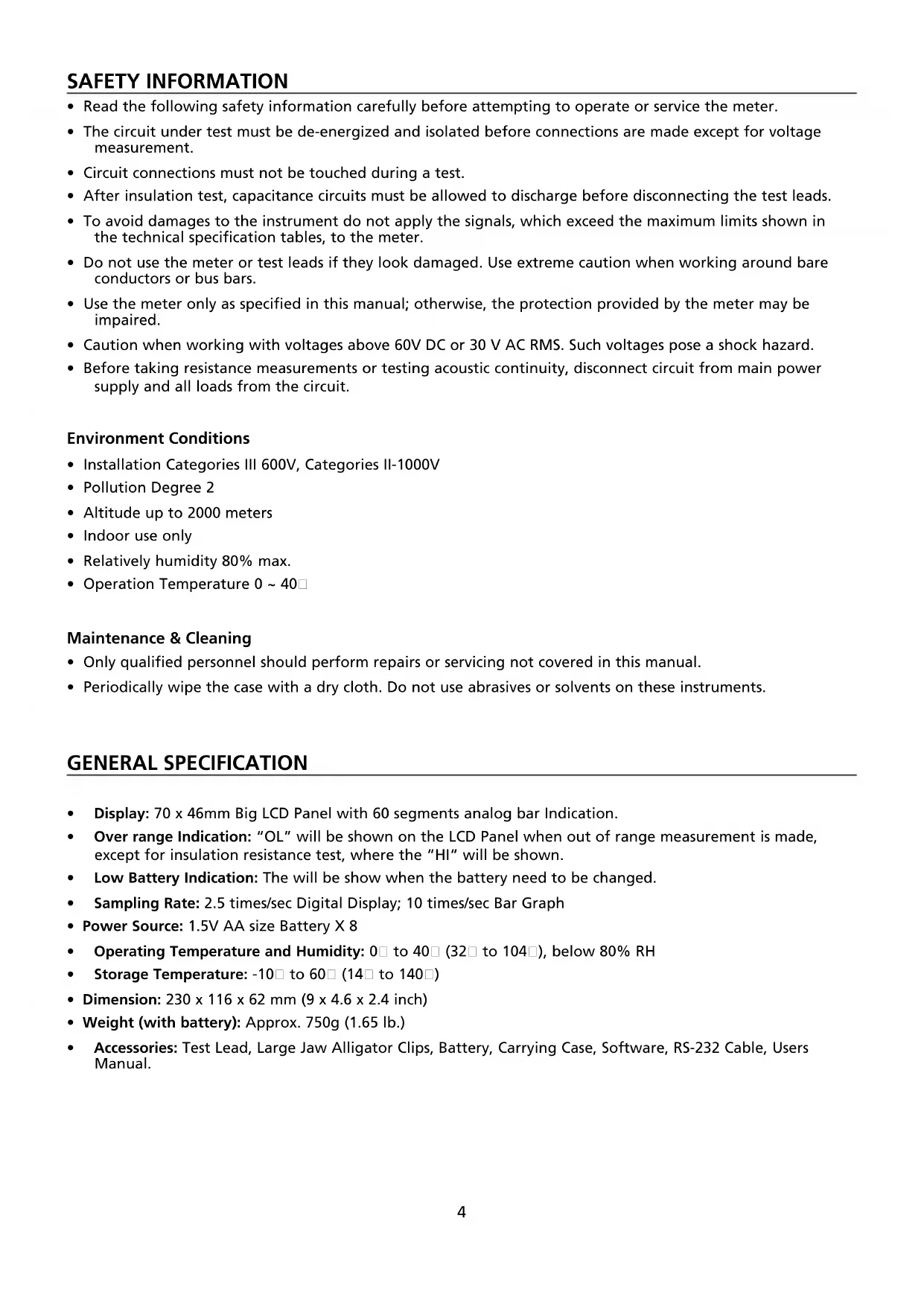 - Periodically wipe the case with a dry cloth. Do not use abrasives or solvents on these instruments. GENERAL SPECIFICATION