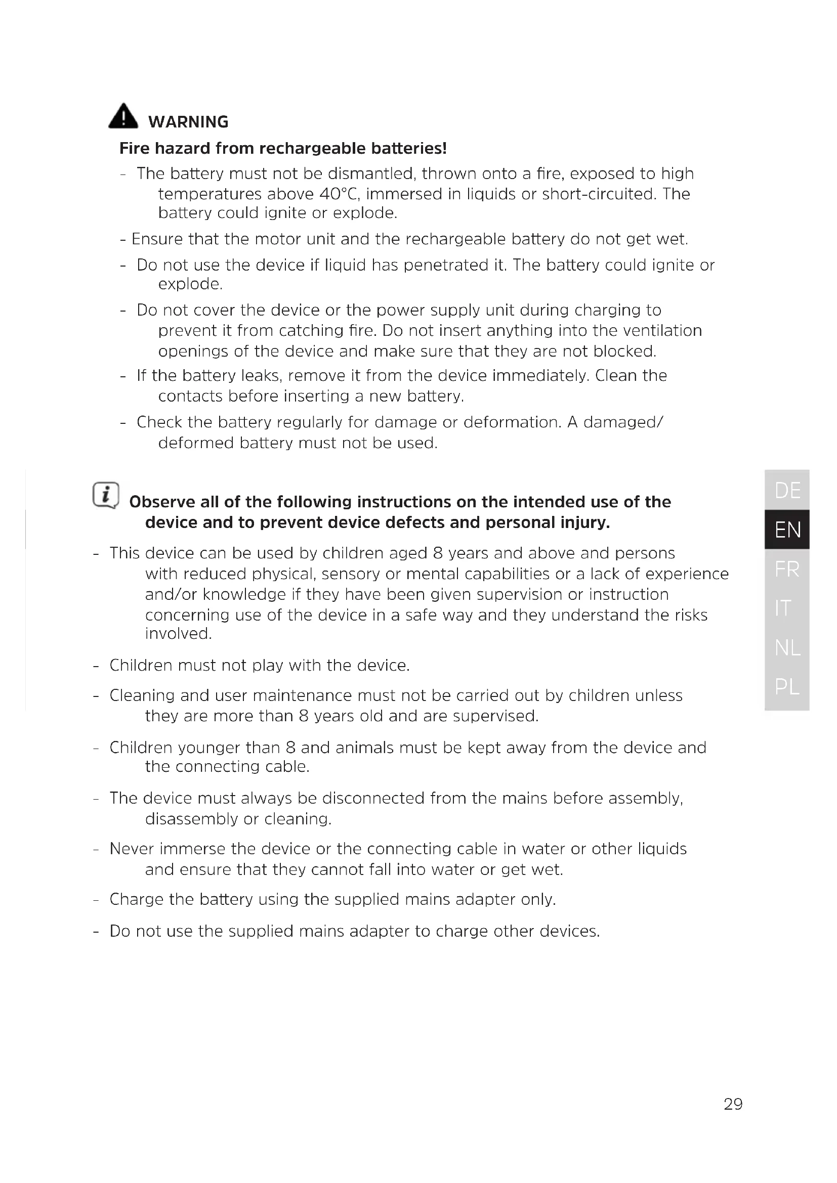 WARNING Fire hazard from rechargeable baeries! - The baery must not be dismantled, thrown onto a fire, exposed to high temperatures above 40°C, immersed in liquids or short-circuited. The baery could ignite or explode. - Ensure that the motor unit and the rechargeable baery do not get wet. - Do not use the device if liquid has penetrated it. The baery could ignite or explode. - Do not cover the device or the power supply unit during charging to prevent it from catching fire. Do not insert anything into the ventilation openings of the device and make sure that they are not blocked. - If the baery leaks, remove it from the device immediately. Clean the contacts before inserting a new baery. - Check the baery regularly for damage or deformation. A damaged/ deformed baery must not be used. Observe all of the following instructions on the intended use of the device and to prevent device defects and personal injury. - This device can be used by children aged 8 years and above and persons with reduced physical, sensory or mental capabilities or a lack of experience and/or knowledge if they have been given supervision or instruction concerning use of the device in a safe way and they understand the risks involved. - Children must not play with the device. - Cleaning and user maintenance must not be carried out by children unless they are more than 8 years old and are supervised. - Children younger than 8 and animals must be kept away from the device and the connecting cable. - The device must always be disconnected from the mains before assembly, disassembly or cleaning. - Never immerse the device or the connecting cable in water or other liquids and ensure that they cannot fall into water or get wet. - Charge the baery using the supplied mains adapter only. - Do not use the supplied mains adapter to charge other devices.30 - In the interest of your own safety, check the device for damage before each use. Use the device only if it is undamaged! If the device or the connecting cable are damaged, they must be replaced by the manufacturer, customer service or a similarly qualified person (e.g. a specialist workshop) in order to avoid hazards. Risk of material damage - Ensure that the mains cable is not crushed, bent or laid over sharp edges and does not come into contact with hot surfaces. - Do not wind the mains cable around the device or the mains adapter. - Use the device if it has been fully and correctly assembled. The dust holder and the filters must be inserted and be undamaged! Damage to the motor could occur if dirt were to get inside the motor unit. - Unplug the mains adapter if a fault occurs during charging or before a thunderstorm. - The device must be switched o when the mains adapter is unplugged from, or plugged into, a socket. Always pull on the mains adapter and never on the mains cable to disconnect the device from the mains! - Do not use the device if it is still connected to the mains adapter. - Never pull or carry the device by the mains cable. - Keep the device away from heat, naked flames, extreme temperatures, prolonged humidity, moisture and knocks. - Use original accessories only so as not to impair operation of the device and to prevent potential damage. The LEDs are not replaceable.31