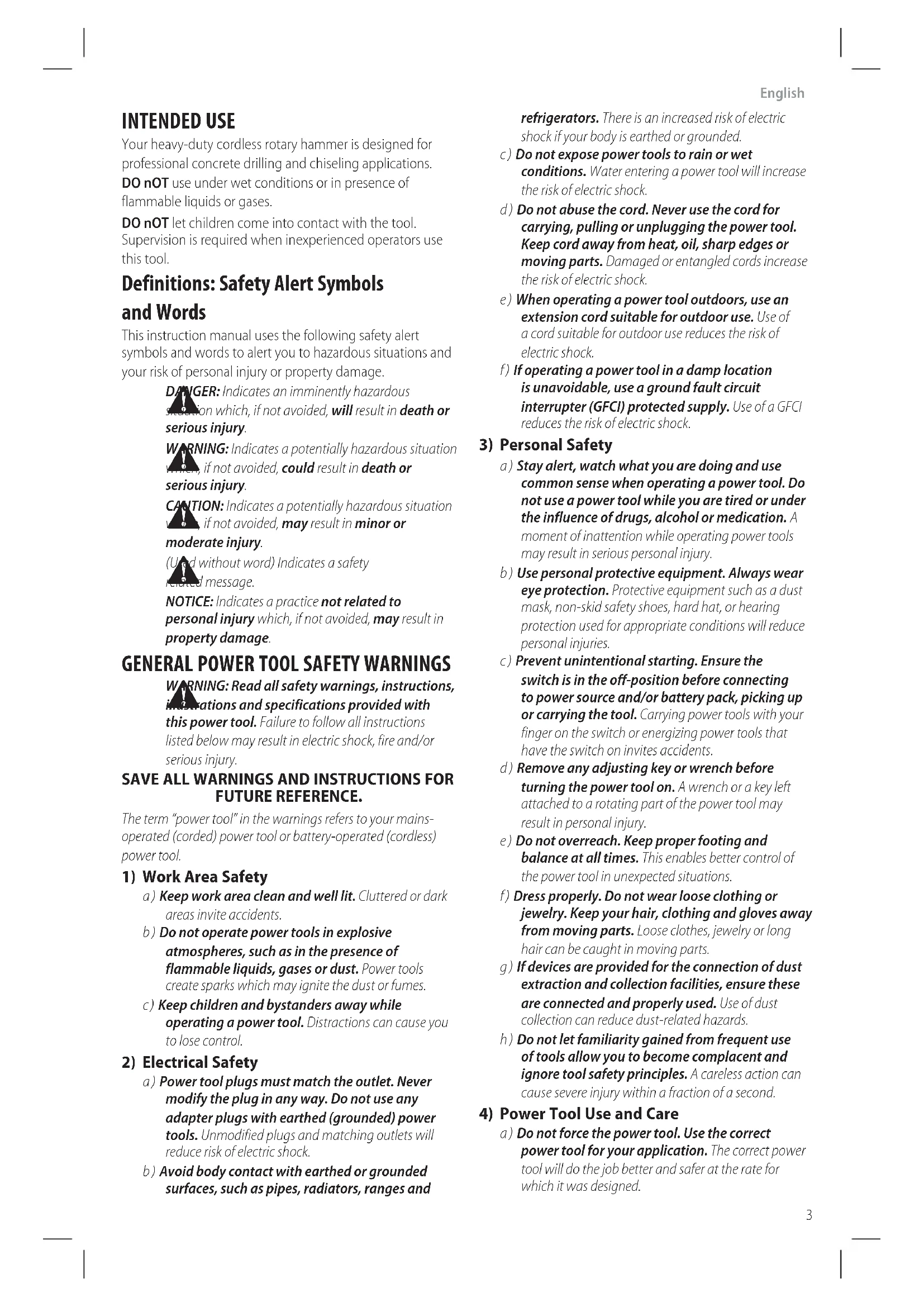 (Used without word) Indicates a safety relatedmessage. NOTICE: Indicates a practice not related to personal injury which, if not avoided, may result in propertydamage. INTENDED USE Your heavy-duty cordless rotary hammer is designed for professional concrete drilling and chiselingapplications. DO nOT use under wet conditions or in presence of flammable liquids orgases. DO nOT let children come into contact with the tool. Supervision is required when inexperienced operators use thistool. English (original instructions)English