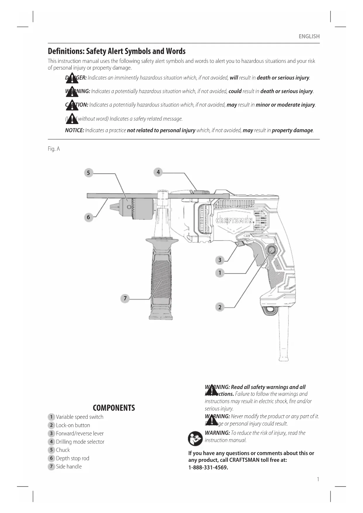 FUTURE USE COMPONENTS (FIG. A) Motor Be sure your power supply agrees with the nameplate marking. Voltage decrease of more than 10% will cause loss of power and overheating. These tools are factory tested; if this tool does not operate, check power supply. Intended Use This hammer drill is designed for professional use. DO NOT use under wet conditions or in presence of flammable liquids orgases. DO NOT let children come into contact with the tool. Supervision is required when inexperienced operators use thistool.5 English Fig. B