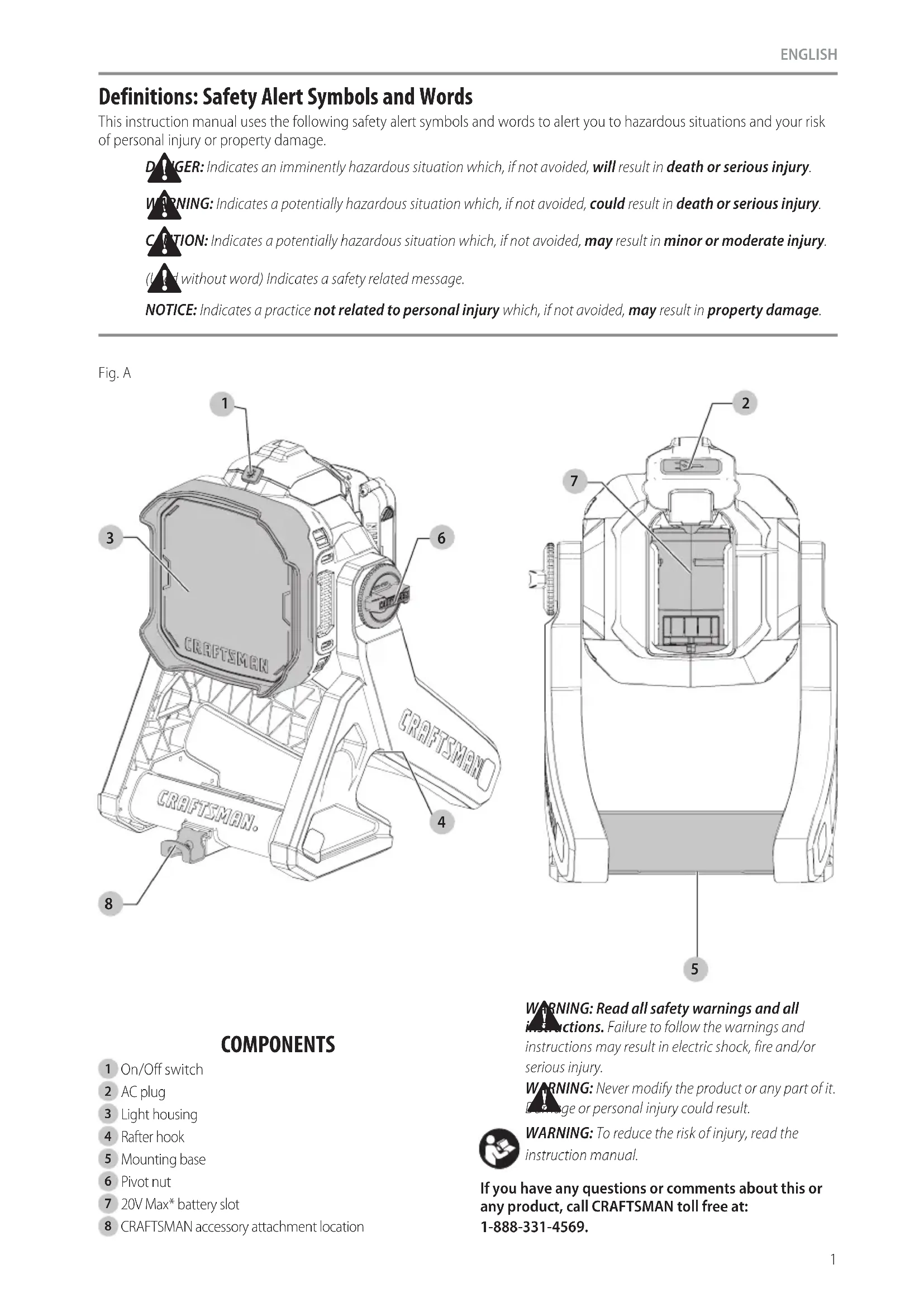 instructionmanual. If you have any questions or comments about this or any product, call CRAFTSMAN toll free at: