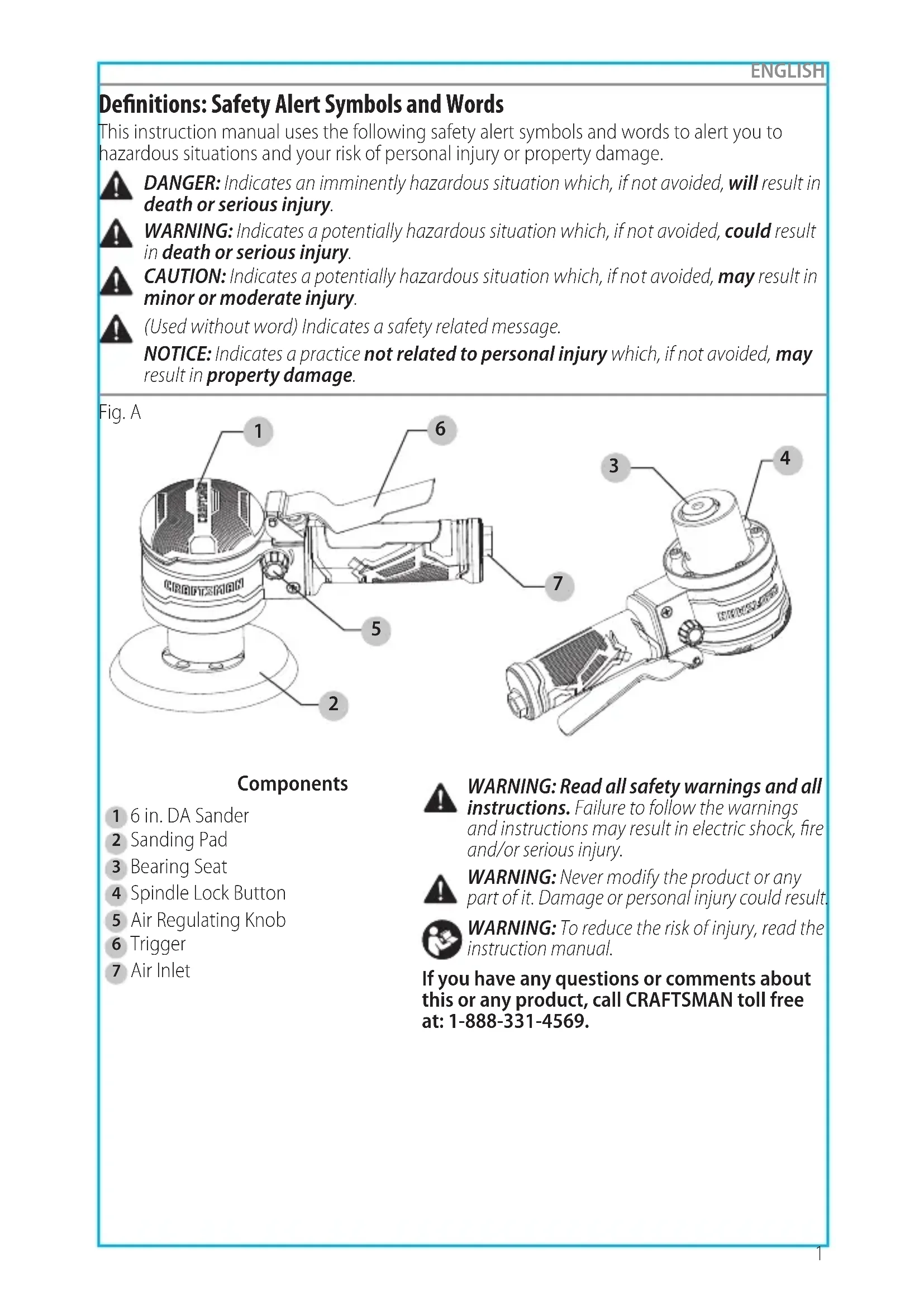 instruction manual. If you have any questions or comments about this or any product, call CRAFTSMAN toll free at: 1-888-331-4569.