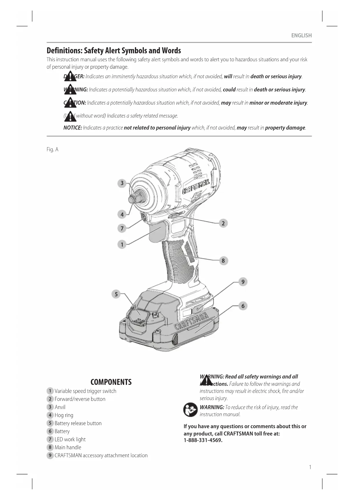 FUTURE USE Cat # Ft.-Lbs. In.-Lbs. Nm CMCF910 165 1980 220 Components (Fig. A) Intended Use This impact driver is designed for household impact screwdriving applications. The impact function makes this tool particularly useful for driving fasteners in wood, metal and concrete. DO NOT use under wet conditions or in presence of flammable liquids or gases. DO NOT let children come into contact with the tool. Supervision is required when inexperienced operators use this tool.