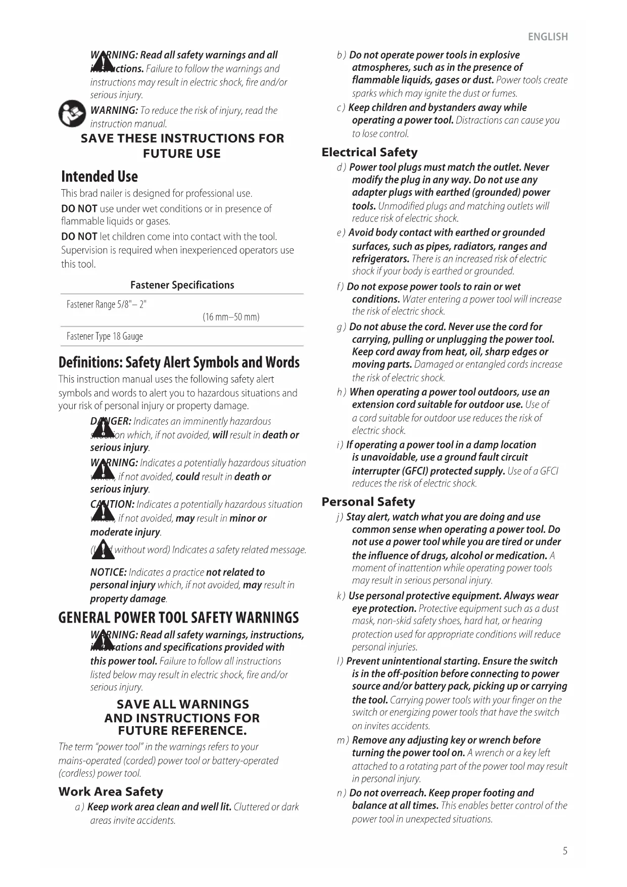FUTURE USE Intended Use This brad nailer is designed for professional use. DO NOT use under wet conditions or in presence of flammable liquids orgases. DO NOT let children come into contact with the tool. Supervision is required when inexperienced operators use thistool. Fastener Specifications Fastener Range 5/8"– 2" (16 mm–50 mm) Fastener Type 18 Gauge Components Tool Use brad nailer professionalEnglish