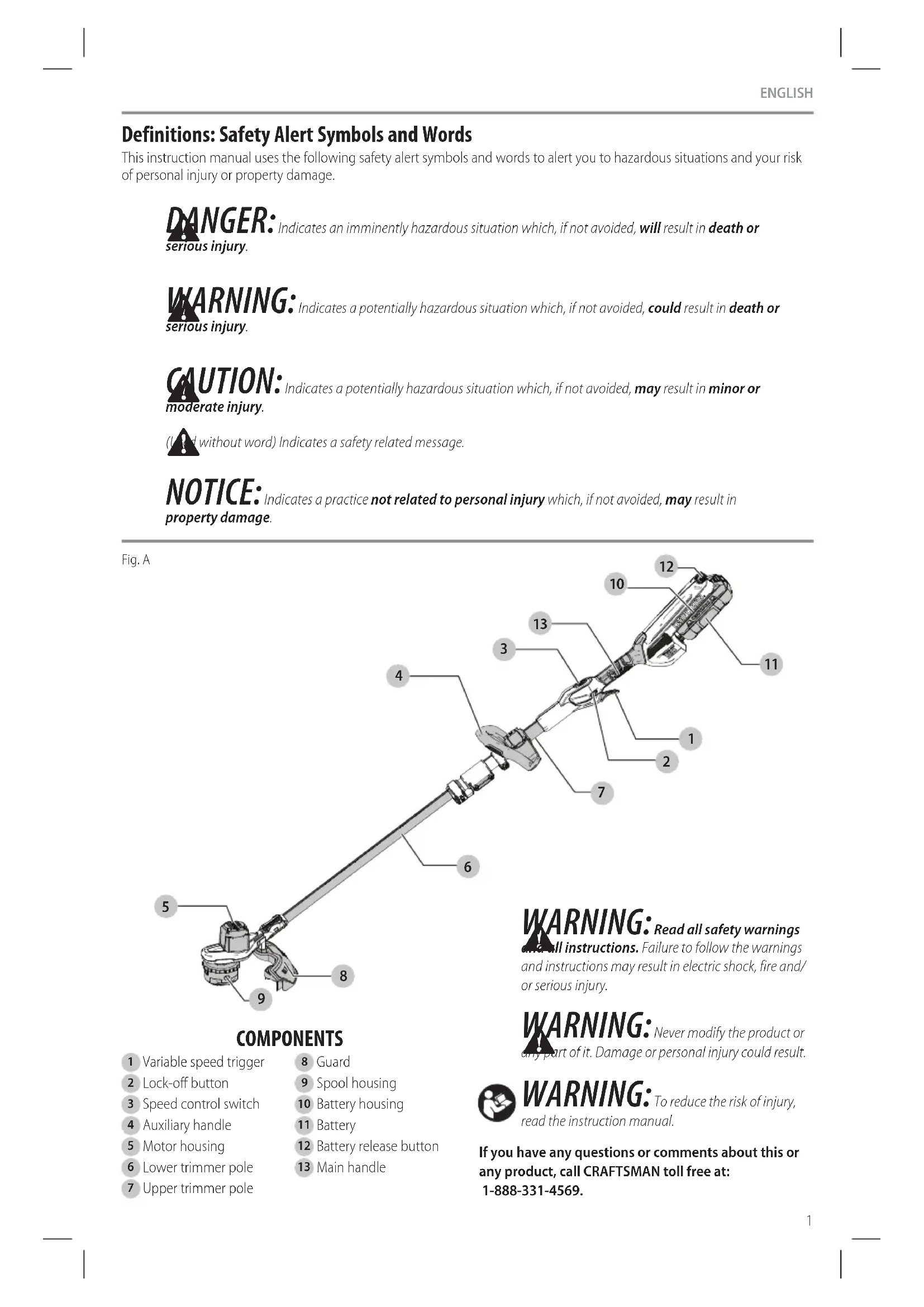 clean to avoid overheating.2. Your trimmer line can dry out over time. 3. Plastic parts may be cleaned by using a mild soap and a damprag.4. The line cutter on the edge of the guard can dull over time. It is recommended you periodically touch-up the sharpness of the blade with afile. Four Year Limited Warranty CRAFTSMAN will repair or replace, without charge, any defects due to faulty materials or workmanship for four years from the date of purchase. This warranty does not cover part failure due to normal wear or tool abuse. For further detail of warranty coverage and warranty repair information, visit www.craftsman.com or call 1-888-331-4569. This warranty does not apply to accessories or damage caused where repairs have been made or attempted by others. THIS LIMITED WARRANTY IS GIVEN IN LIEU OF ALL OTHERS, INCLUDING THE IMPLIED WARRANTY OF MERCHANTABILITY AND FITNESS FOR A PARTICULAR PURPOSE, AND EXCLUDES ALL INCIDENTAL OR CONSEQUENTIAL DAMAGES. Some states do not allow limitations on how long an implied warranty lasts or the exclusion or limitation of incidental or consequential damages, so these limitations may not apply to you. This warranty gives you specific legal rights and you may have other rights which vary in certain states orprovinces. NOTE: Battery warranty voided if the battery pack is tampered with in any way. CRAFTSMAN is not responsible for any injury caused by tampering and may prosecute warranty fraud to the fullest extent permitted bylaw.90 DAY MONEY BACK GUARANTEEIf you are not completely satisfied with the performance of your CRAFTSMAN Power Tool or Nailer for any reason, you can return it within 90 days from the date of purchase with a receipt for a full refund – no questionsasked.LATIN AMERICA: This warranty does not apply to products sold in Latin America. For products sold in Latin America, see country specific warranty information contained in the packaging, call the local company or see website for warrantyinformation.FREE WARNING LABEL REPLACEMENT: If your warning labels become illegible or are missing, call 1-888-331-4569 for a freereplacement.FRANÇAIS