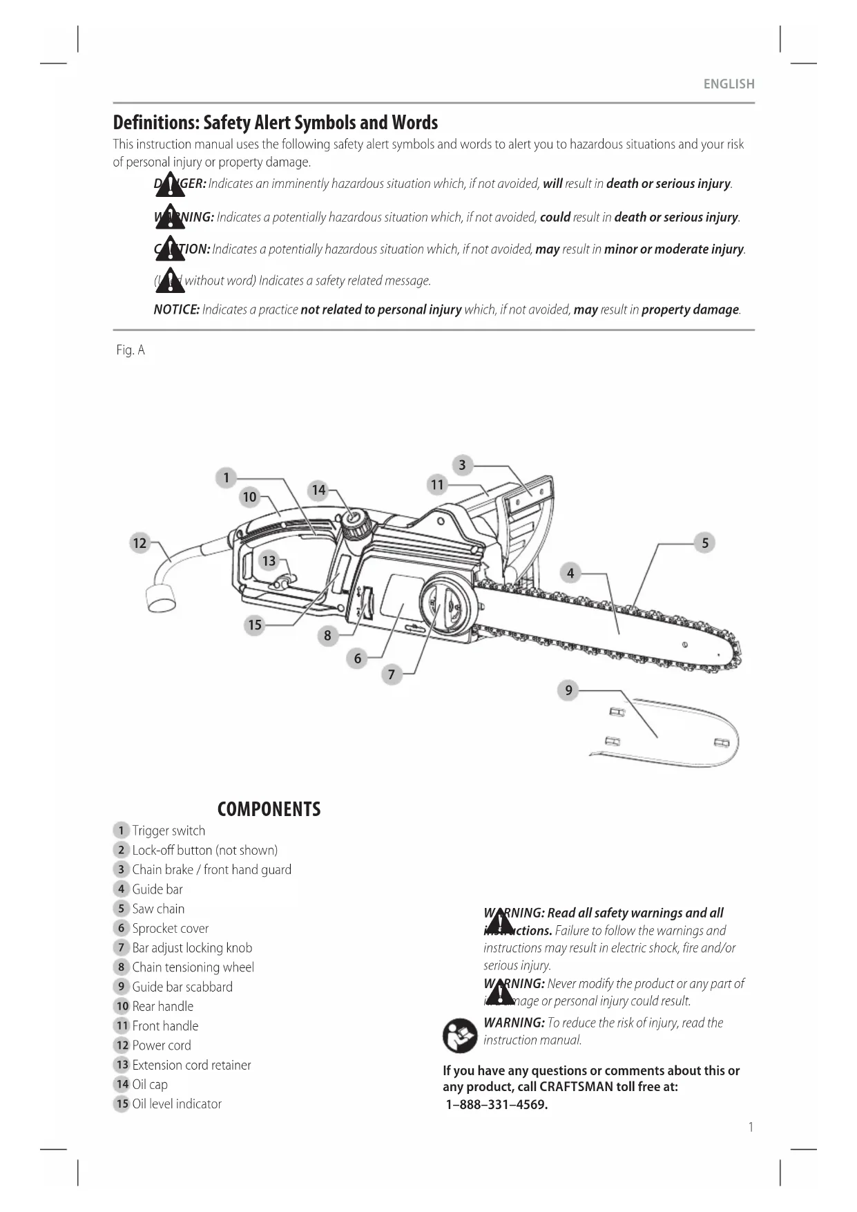 instructionmanual. If you have any questions or comments about this or any product, call CRAFTSMAN toll free at: 1–888–331–4569. Fig. A