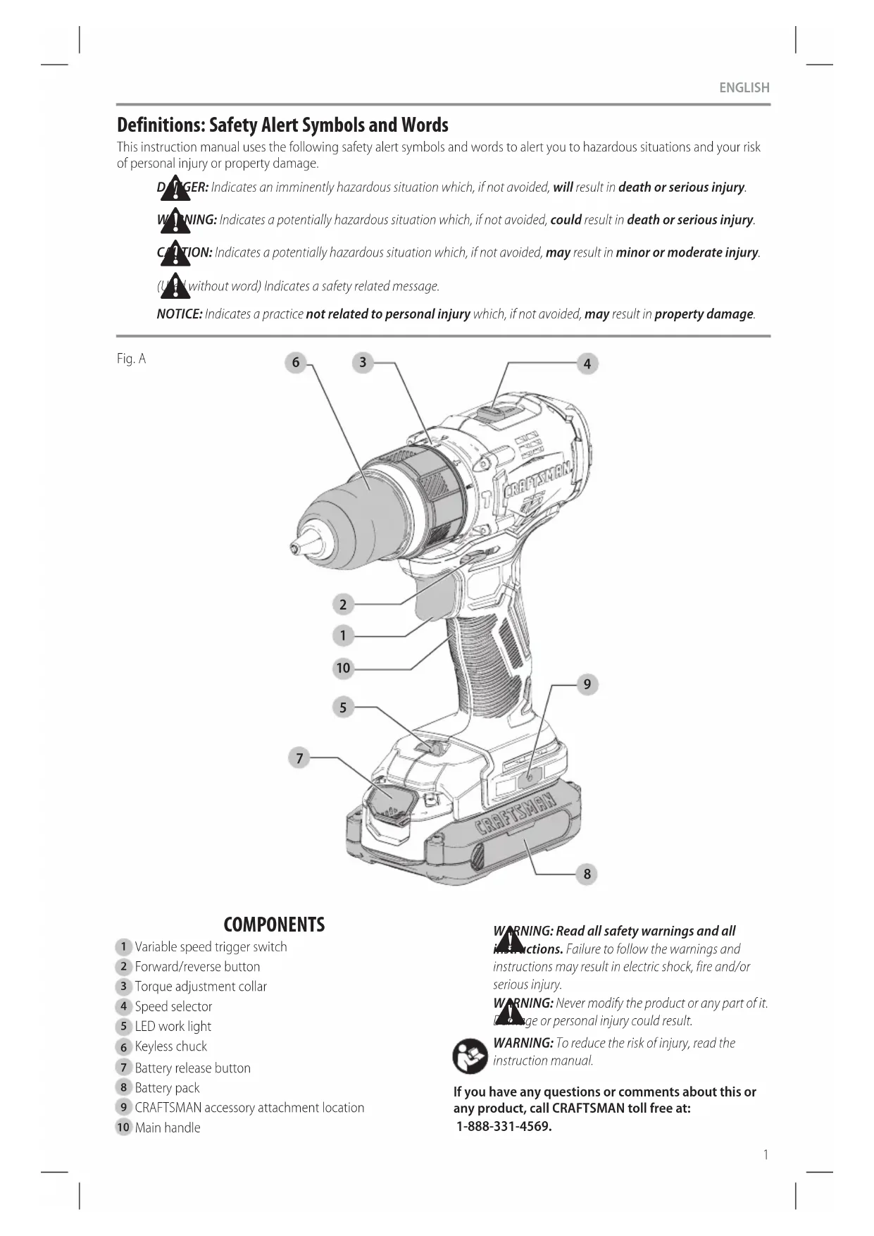- FOR YOUR SAFETY: Registering your product will allow us to contact you in the unlikely event a safety notification is required under the Federal Consumer SafetyAct. Register online at www.craftsman.com/registration Three Year Limited Warranty CRAFTSMAN will repair or replace, without charge, any defects due to faulty materials or workmanship for three years from the date of purchase (two years for batteries). This warranty does not cover part failure due to normal wear or tool abuse. For further detail of warranty coverage and warranty repair information, visit www.craftsman.com or call 1-888-331-4569. This warranty does not apply to accessories or damage caused where repairs have been made or attempted by others. THIS LIMITED WARRANTY IS GIVEN IN LIEU OF ALL OTHERS, INCLUDING THE IMPLIED WARRANTY OF MERCHANTABILITY AND FITNESS FOR A