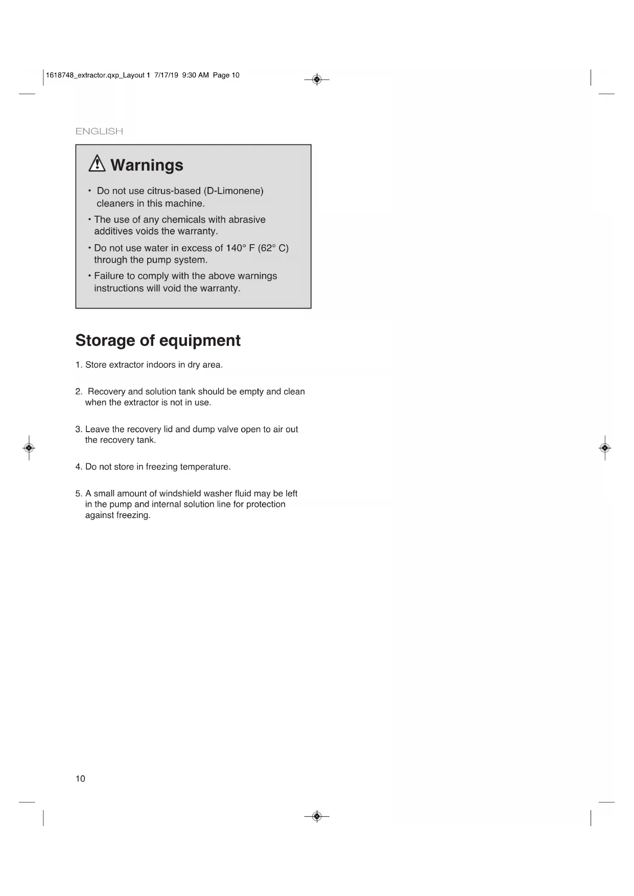 1. Store extractor indoors in dry area.