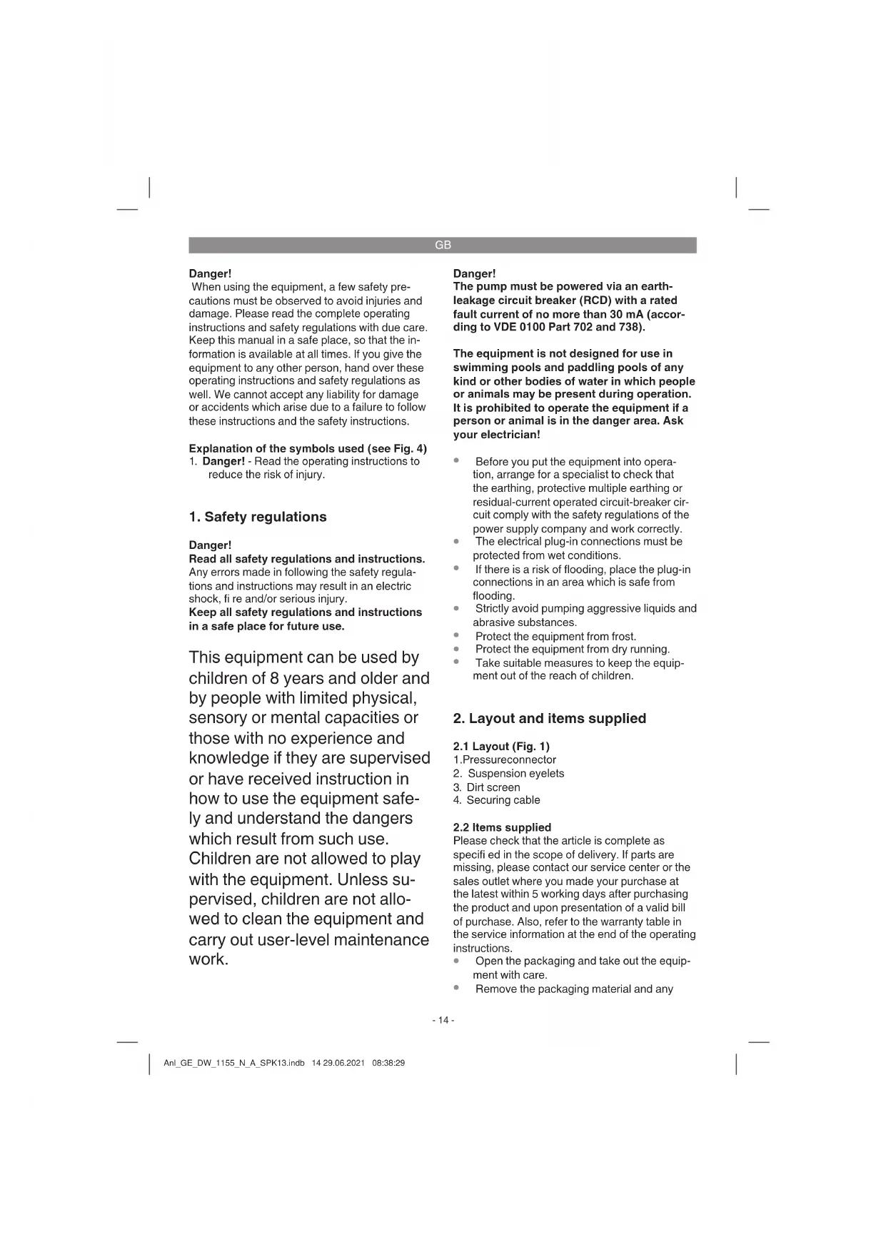 Danger! Read all safety regulations and instructions. Any errors made in following the safety regula- tions and instructions may result in an electric shock, fi re and/or serious injury. Keep all safety regulations and instructions in a safe place for future use. This equipment can be used by children of 8 years and older and by people with limited physical, sensory or mental capacities or those with no experience and knowledge if they are supervised or have received instruction in how to use the equipment safe- ly and understand the dangers which result from such use. Children are not allowed to play with the equipment. Unless su- pervised, children are not allo- wed to clean the equipment and carry out user-level maintenance work. Danger! The pump must be powered via an earth- leakage circuit breaker (RCD) with a rated fault current of no more than 30 mA (accor- ding to VDE 0100 Part 702 and 738). The equipment is not designed for use in swimming pools and paddling pools of any kind or other bodies of water in which people or animals may be present during operation. It is prohibited to operate the equipment if a person or animal is in the danger area. Ask your electrician!