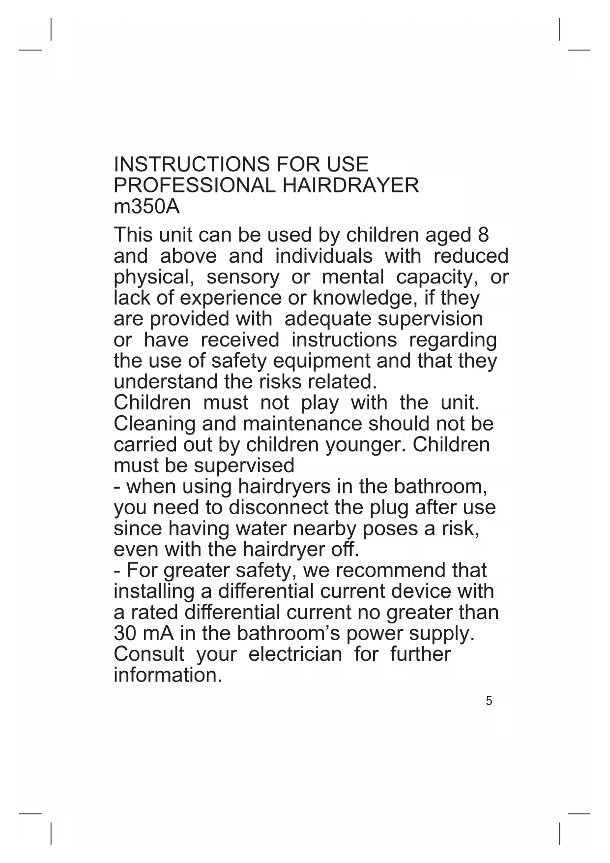 This unit can be used by children aged 8 and above and individuals with reduced physical, sensory or mental capacity, or lack of experience or knowledge, if they are provided with adequate supervision or have received instructions regarding the use of safety equipment and that they understand the risks related. Children must not play with the unit. Cleaning and maintenance should not be carried out by children younger. Children must be supervised - when using hairdryers in the bathroom, you need to disconnect the plug after use since having water nearby poses a risk, even with the hairdryer o. - For greater safety, we recommend that installing a dierential current device with a rated dierential current no greater than 30 mA in the bathroom’s power supply. Consult your electrician for further information.