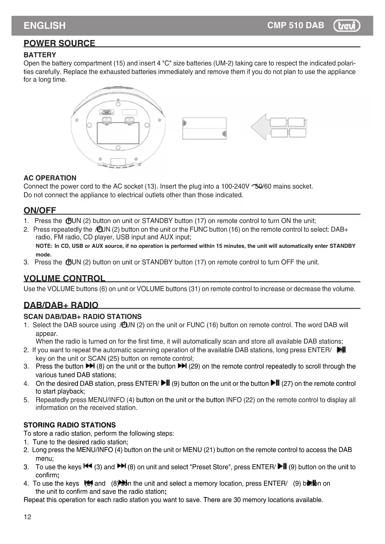CMP 510 DAB POWER SOURCE BATTERY Open the battery compartment (15) and insert 4 "C" size batteries (UM-2) taking care to respect the indicated polari- ties carefully. Replace the exhausted batteries immediately and remove them if you do not plan to use the appliance for a long time. AC OPERATION Connect the power cord to the AC socket (13). Insert the plug into a 100-240V 50/60 mains socket. Do not connect the appliance to electrical outlets other than those indicated. ON/OFF