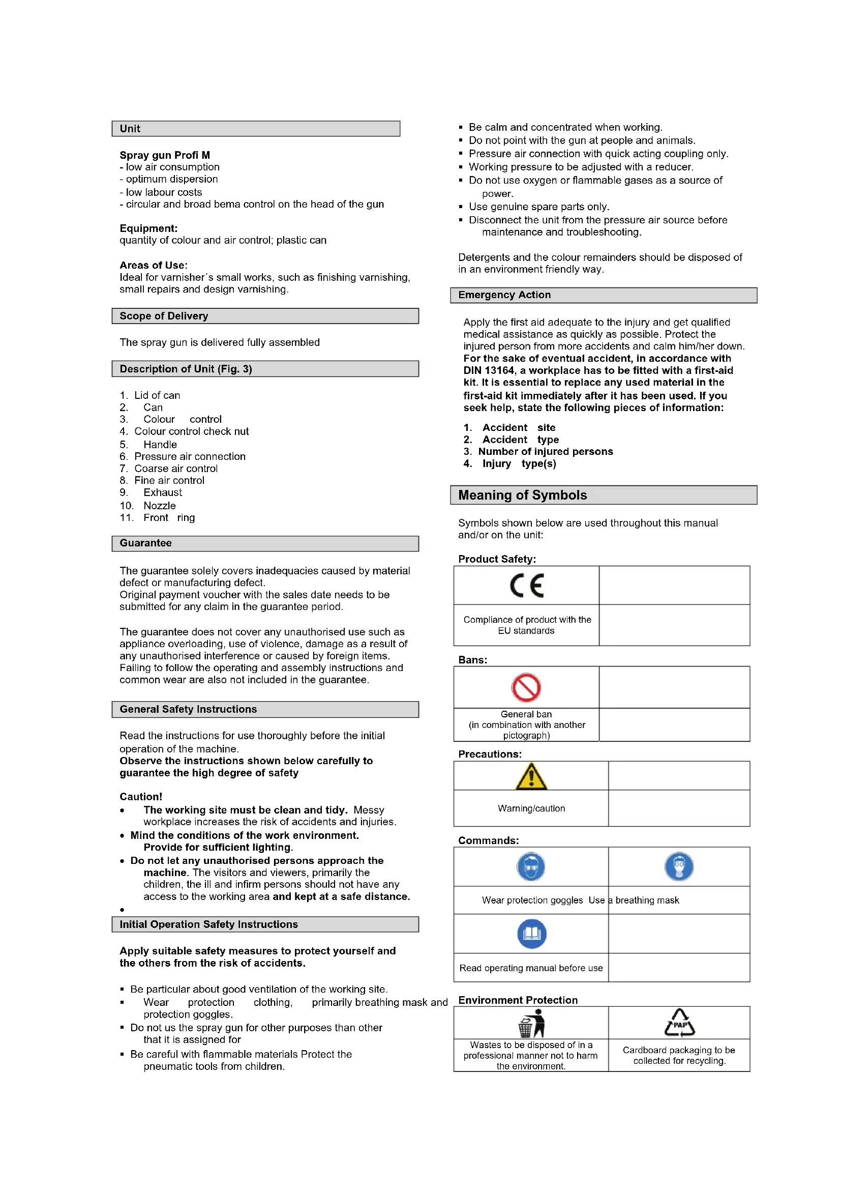 Initial Operation Safety Instructions Apply suitable safety measures to protect yourself and the others from the risk of accidents. Be particular about good ventilation of the working site. Wear protection clothing, primarily breathing mask and protection goggles. Do not us the spray gun for other purposes than other that it is assigned for Be careful with flammable materials Protect the pneumatic tools from children. Be calm and concentrated when working. Do not point with the gun at people and animals. Pressure air connection with quick acting coupling only. Working pressure to be adjusted with a reducer. Do not use oxygen or flammable gases as a source of power. Use genuine spare parts only. Disconnect the unit from the pressure air source before maintenance and troubleshooting. Detergents and the colour remainders should be disposed of in an environment friendly way. Emergency Action Apply the first aid adequate to the injury and get qualified medical assistance as quickly as possible. Protect the injured person from more accidents and calm him/her down. For the sake of eventual accident, in accordance with DIN 13164, a workplace has to be fitted with a first-aid kit. It is essential to replace any used material in the first-aid kit immediately after it has been used. If you seek help, state the following pieces of information: