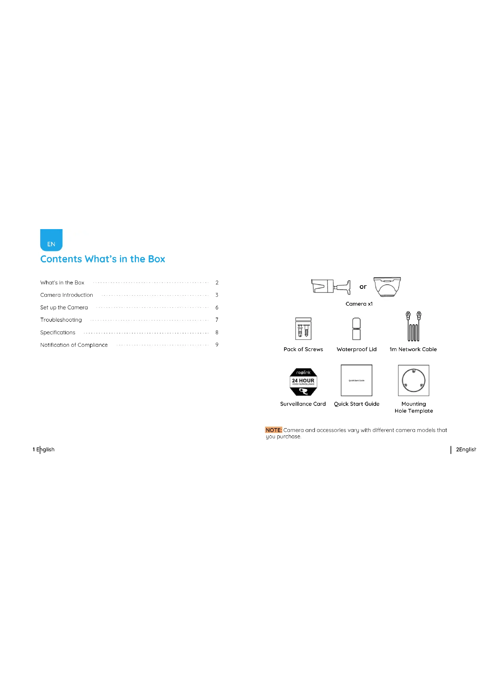 Room B, 4th Floor, Kingway Commercial Building, 171-173 Lockhart Road, Wan Chai, Hong Kong @ReolinkTech https://reolink.com2English 1 English Contents What’s in the Box What’s in the Box Camera Introduction Set up the Camera Troubleshooting Specifications Notification of Compliance