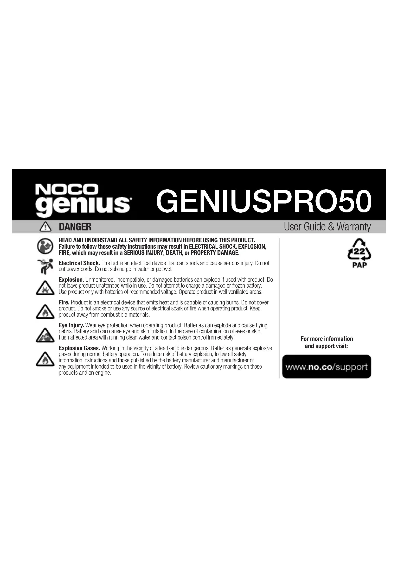 GENIUSPRO50GENIUSPRO50 User Guide & Warranty DANGER READ AND UNDERSTAND ALL SAFETY INFORMATION BEFORE USING THIS PRODUCT. Failure to follow these safety instructions may result in ELECTRICAL SHOCK, EXPLOSION, FIRE, which may result in a SERIOUS INJURY, DEATH, or PROPERTY DAMAGE. Electrical Shock. Product is an electrical device that can shock and cause serious injury. Do not cut power cords. Do not submerge in water or get wet. Explosion. Unmonitored, incompatible, or damaged batteries can explode if used with product. Do not leave product unattended while in use. Do not attempt to charge a damaged or frozen battery. Use product only with batteries of recommended voltage. Operate product in well ventilated areas. Fire. Product is an electrical device that emits heat and is capable of causing burns. Do not cover product. Do not smoke or use any source of electrical spark or fire when operating product. Keep product away from combustible materials. Eye Injury. Wear eye protection when operating product. Batteries can explode and cause flying debris. Battery acid can cause eye and skin irritation. In the case of contamination of eyes or skin, flush aected area with running clean water and contact poison control immediately. Explosive Gases. Working in the vicinity of a lead-acid is dangerous. Batteries generate explosive gases during normal battery operation. To reduce risk of battery explosion, follow all safety information instructions and those published by the battery manufacturer and manufacturer of any equipment intended to be used in the vicinity of battery. Review cautionary markings on these products and on engine. For more information and support visit:About GENIUSPRO50. The NOCO GENIUSPRO50 represents some of the most innovative and advanced technology on the market, making each charge simple and easy. It is quite possibly the safest and most ecient charger you will ever use. The GENIUSPRO50 is designed for charging all types of 6V, 12V and 24V lead-acid batteries, including Wet (Flooded), Gel, MF (Maintenance-Free), CA (Calcium), EFB (Enhanced Flooded Battery), and AGM (Absorption Glass Mat), in addition to 6V, 12V and 24V Lithium (LiFePO4) batteries. It is suitable for charging battery capacities up to 2000 Amp-Hours (6V and 12V), 1000 Amp-Hours (24V) and maintaining all battery sizes. Getting Started. Before using the charger, carefully read the battery manufacturer’s specific precautions and recommended rates of charge for the battery. Make sure to determine the voltage and chemistry of the battery by referring to your battery owner’s manual prior to charging. Mounting. It is important to keep in mind the distance to the battery. The DC cable length from the charger, with either the battery clamp or eyelet terminal connectors, is approximately 72 inches (182.88cm). Allow for 12-inches (30.4cm) of slack between connections. Proposition 65. WARNING: This product can expose you to chemicals including lead and exhaust fumes, which are known to the State of California to cause cancer and birth defects or other reproductive harm. For more information go to www.P65Warnings.ca.gov. Personal Precaution. Only use product as intended. Someone should be within range of your voice or close enough to come to your aid in case of emergency. Have a supply of clean water and soap nearby in the case of battery acid contamination. Wear complete eye protection and protective clothing while working near a battery. Always wash hands after handling batteries and related materials. Do not handle or wear any metal objects when working with batteries including; tools, watches or jewelry. If metal is dropped onto battery, it may spark or create a short circuit resulting in electrical shock, fire, explosion which may result in injury, death or property damage. Minors. If the product is intended by “Purchaser” to be used by a minor, purchasing adult agrees to provide detailed instructions and warnings to any minor prior to use. Failure to do so is the sole responsibility of the “Purchaser,” who agrees to indemnify NOCO for any unintended use or misuse by a minor. Choking Hazard. Accessories may present a choking hazard to children. Do not leave children unattended with product or any accessory. The product is not a toy. Handling. Handle product with care. The product can become damaged if impacted. Do not use a damaged product, including, but not limited to, cracks to the casing or damaged cables. Do not use product with a damaged power cord. Exposure to humidity and liquids may damage product. Store and operate product in dry locations. Do not allow charger to remain wet. Do not disconnect the product by pulling on the cables. Modifications. Do not attempt to alter, modify or repair any part of the product. Disassembling product may cause injury, death or damage to property. If product becomes damaged, malfunctions or comes in contact with any liquid, discontinue use, and contact NOCO. Any modifications to the product will void your warranty. Changes or modifications not expressly approved by the party responsible for compliance could void the user’s authority to operate this device. Accessories. This product is only approved for use with NOCO accessories. NOCO is not responsible for user safety or damage when using accessories not approved by NOCO. Location. Prevent battery acid from coming in contact with the product. Do not operate the product in a closed-in area or an area with restricted ventilation. Do not set a battery on top of product. Position cable leads to avoid accidental damage by moving vehicle parts (including hoods and doors), moving engine parts (including fan blades, belts, and pulleys), or what could become a hazard that may cause injury or death. Operating Temperature. This product is designed to work in ambient temperatures between -4° F and 122° F (-20° C and 50° C). Do not store or operate outside of the specified Important Safety InstructionsEN temperature range