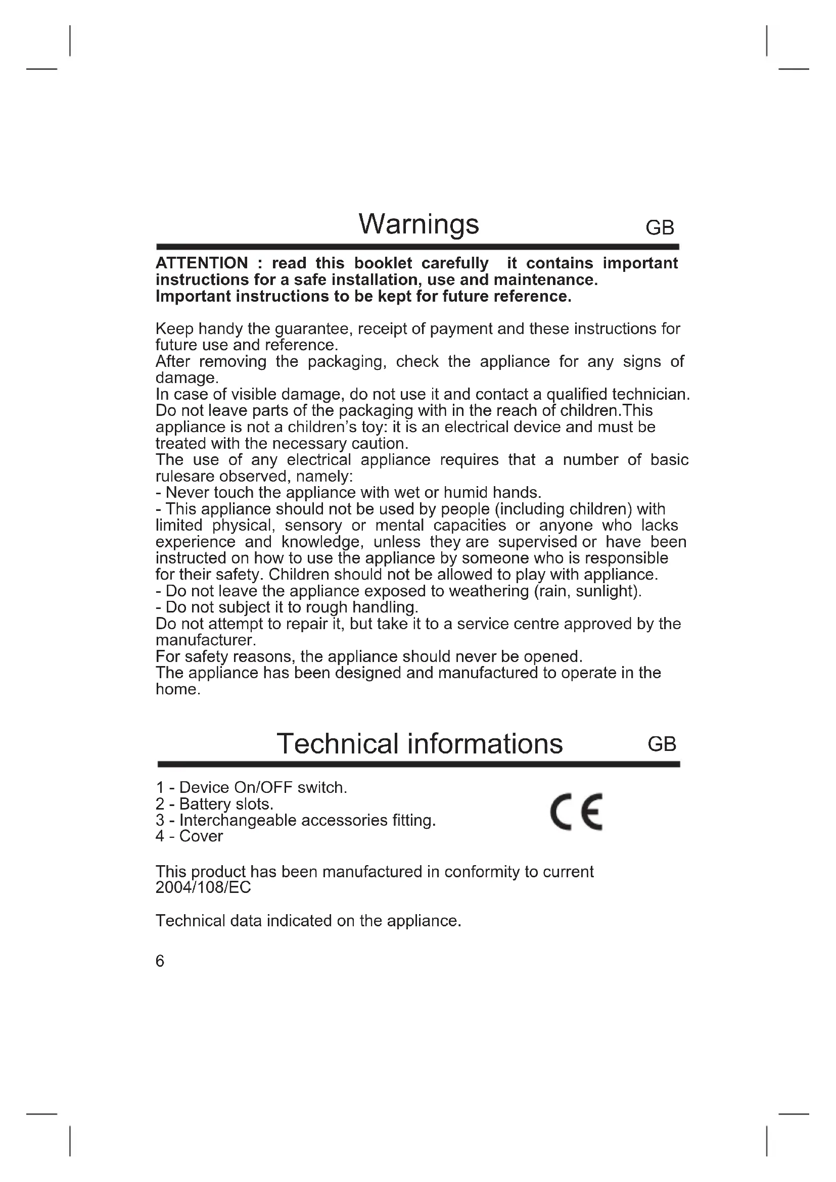 ATTENTION : read this booklet carefully it contains important instructions for a safe installation, use and maintenance. Important instructions to be kept for future reference. Keep handy the guarantee, receipt of payment and these instructions for future use and reference. After removing the packaging, check the appliance for any signs of damage. In case of visible damage, do not use it and contact a qualied technician. Do not leave parts of the packaging with in the reach of children.This appliance is not a children’s toy: it is an electrical device and must be treated with the necessary caution. The use of any electrical appliance requires that a number of basic rulesare observed, namely: - Never touch the appliance with wet or humid hands. - This appliance should not be used by people (including children) with limited physical, sensory or mental capacities or anyone who lacks experience and knowledge, unless they are supervised or have been instructed on how to use the appliance by someone who is responsible for their safety. Children should not be allowed to play with appliance. - Do not leave the appliance exposed to weathering (rain, sunlight). - Do not subject it to rough handling. Do not attempt to repair it, but take it to a service centre approved by the manufacturer. For safety reasons, the appliance should never be opened. The appliance has been designed and manufactured to operate in the home.