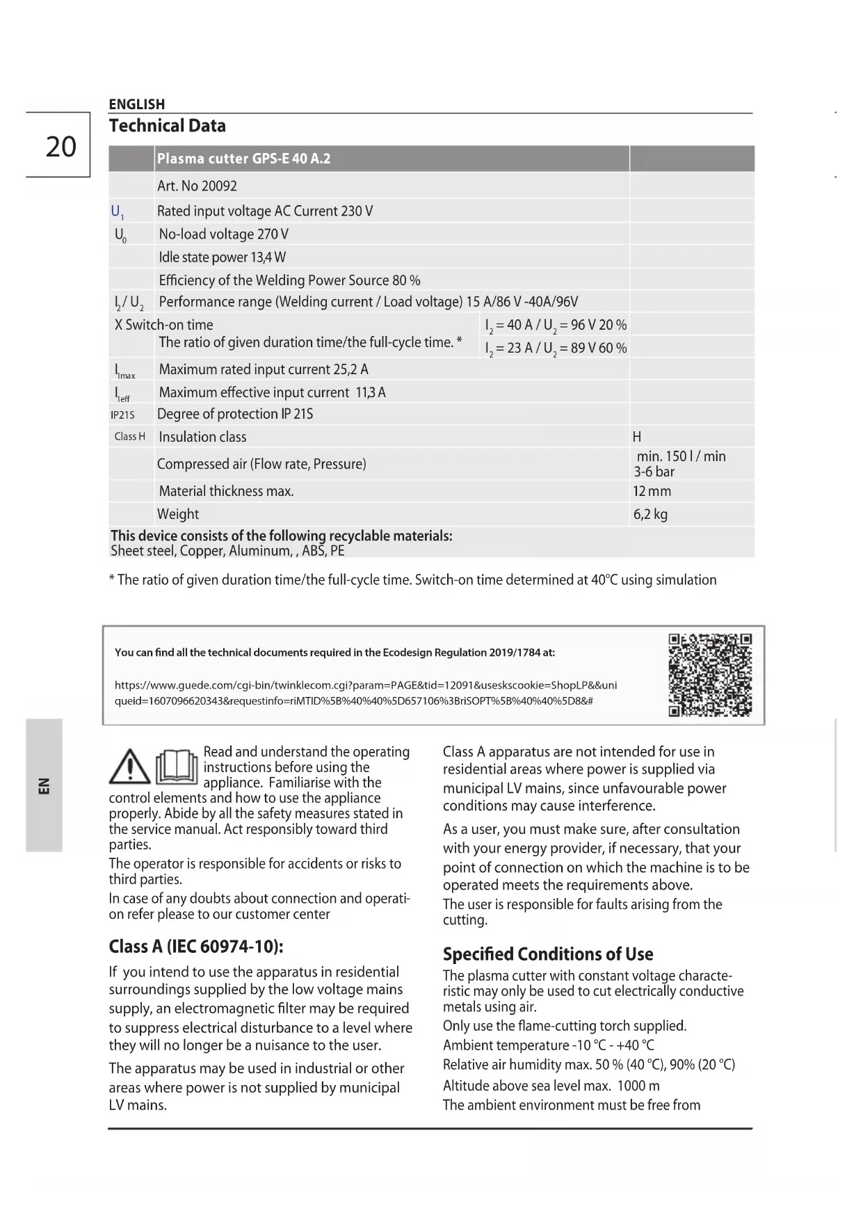 on refer please to our customer center Class A (IEC 60974-10): If you intend to use the apparatus in residential surroundings supplied by the low voltage mains supply, an electromagnetic lter may be required to suppress electrical disturbance to a level where they will no longer be a nuisance to the user. The apparatus may be used in industrial or other areas where power is not supplied by municipal LV mains. Class A apparatus are not intended for use in residential areas where power is supplied via municipal LV mains, since unfavourable power conditions may cause interference. As a user, you must make sure, after consultation with your energy provider, if necessary, that your point of connection on which the machine is to be operated meets the requirements above. The user is responsible for faults arising from the cutting. Specied Conditions of Use The plasma cutter with constant voltage characte- ristic may only be used to cut electrically conductive metals using air. Only use the ame-cutting torch supplied. Ambient temperature -10 °C - +40 °C Relative air humidity max. 50 % (40 °C), 90% (20 °C) Altitude above sea level max. 1000 m The ambient environment must be free from You can nd all the technical documents required in the Ecodesign Regulation 2019/1784 at: https://www.guede.com/cgi-bin/twinklecom.cgi?param=PAGE&tid=12091&useskscookie=ShopLP&&uni queid=1607096620343&requestinfo=riMTID%5B%40%40%5D657106%3BriSOPT%5B%40%40%5D8&#21 abnormal amounts of dust, acids, corrosive gases or substances. Respecting technical data and safety precautions. Do not use this product in any other way as stated for normal use. Not observing general regulations in force and instructions from this manual does not make the manufacturer liable for damages. Please note that our equipment has not been designed for commercial, craft or industrial use. If the equipment is used in commercial, craft or industrial operation or for similar activities, we cannot assume any liability. Requirements for operating sta The operating sta must carefully read the Opera- tingInstructions before using the appliance. Since the use of the device if handled incorrectly can entail considerable risks, only knowledgeable persons may be entrusted with the use of it. The operator must be appropriately trained in setting up, operating and using the machine. Qualication: Apart from the detailed instructions by aprofessional, no special qualication is necessary forappliance using. Minimum age: Persons over 18 years of age can only workon the appliance.An exception includes youngsters trained in order to reachknowledge under supervision of the trainer duringoccupational education. Training: Using the appliance only requires corres