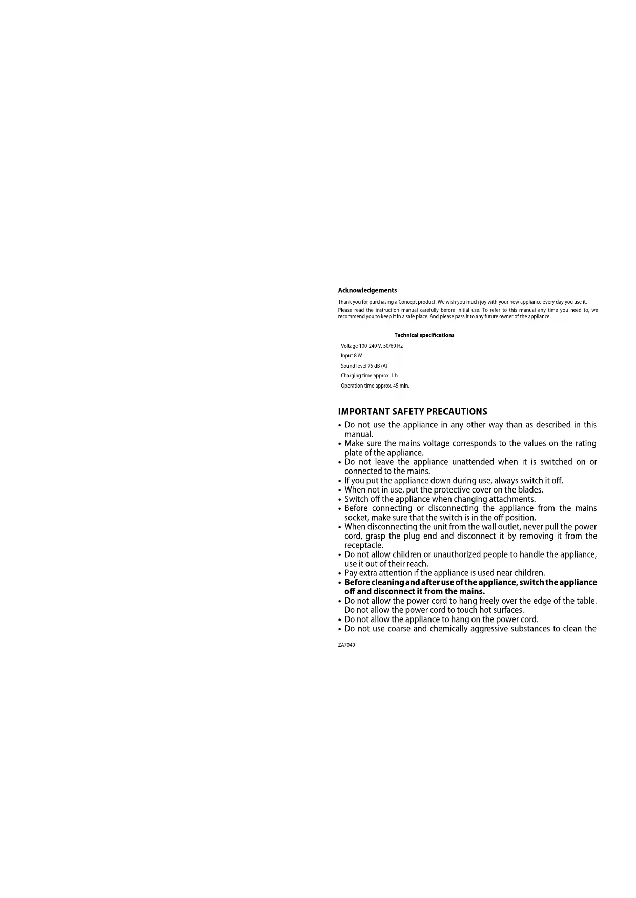 Acknowledgements Thank you for purchasing a Concept product. We wish you much joy with your new appliance every day you use it. Please read the instruction manual carefully before initial use. To refer to this manual any time you need to, we recommend you to keep it in a safe place. And please pass it to any future owner of the appliance. Technical specifications Voltage 100-240 V, 50/60 Hz Input 8 W Sound level 75 dB (A) Charging time approx. 1 h Operation time approx. 45 min.