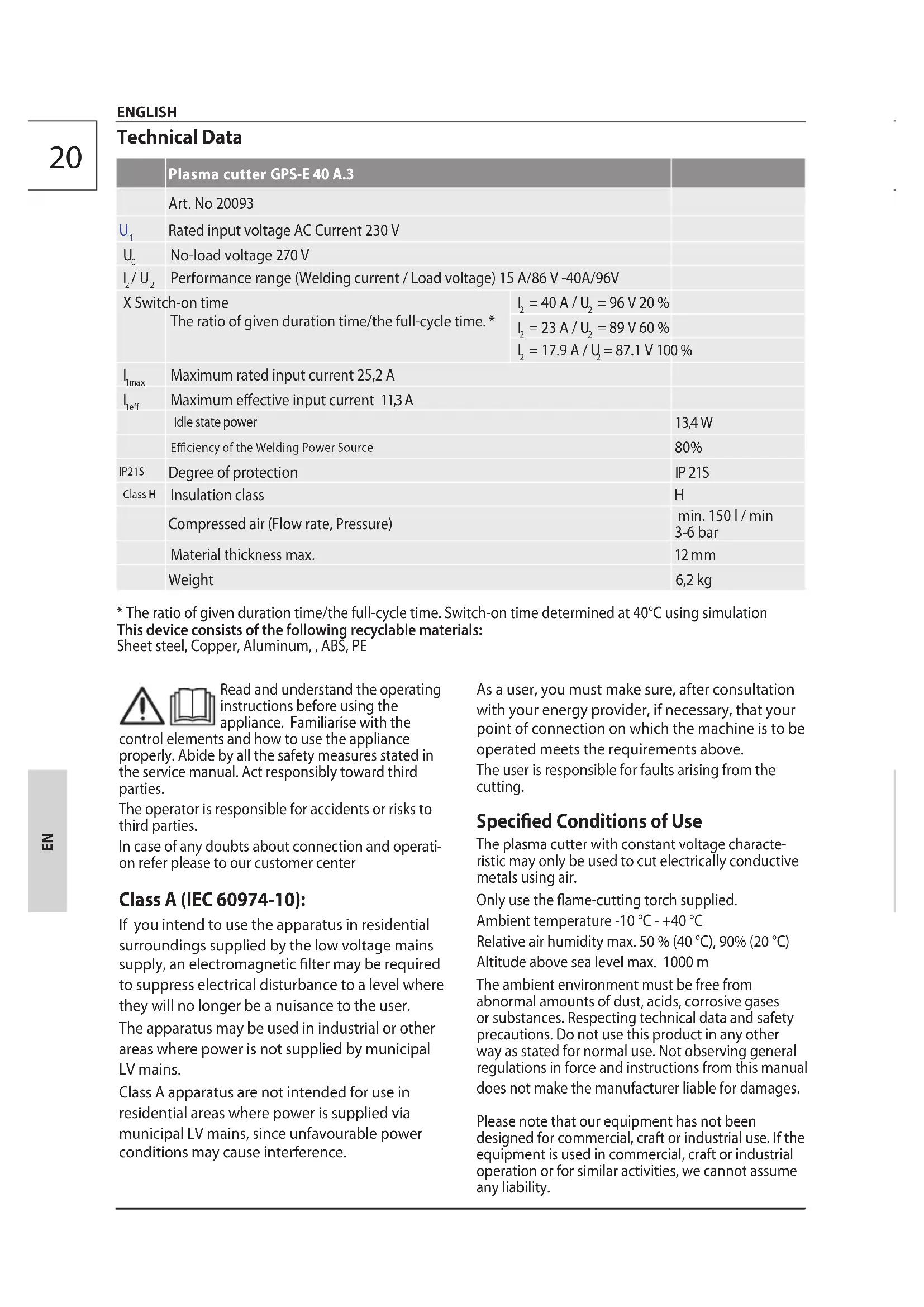 on refer please to our customer center Class A (IEC 60974-10): If you intend to use the apparatus in residential surroundings supplied by the low voltage mains supply, an electromagnetic lter may be required to suppress electrical disturbance to a level where they will no longer be a nuisance to the user. The apparatus may be used in industrial or other areas where power is not supplied by municipal LV mains. Class A apparatus are not intended for use in residential areas where power is supplied via municipal LV mains, since unfavourable power conditions may cause interference. As a user, you must make sure, after consultation with your energy provider, if necessary, that your point of connection on which the machine is to be operated meets the requirements above. The user is responsible for faults arising from the cutting. Specied Conditions of Use The plasma cutter with constant voltage characte- ristic may only be used to cut electrically conductive metals using air. Only use the ame-cutting torch supplied. Ambient temperature -10 °C - +40 °C Relative air humidity max. 50 % (40 °C), 90% (20 °C) Altitude above sea level max. 1000 m The ambient environment must be free from abnormal amounts of dust, acids, corrosive gases or substances. Respecting technical data and safety precautions. Do not use this product in any other way as stated for normal use. Not observing general regulations in force and instructions from this manual does not make the manufacturer liable for damages. Please note that our equipment has not been designed for commercial, craft or industrial use. If the equipment is used in commercial, craft or industrial operation or for similar activities, we cannot assume any liability.21 Requirements for operating sta The operating sta must carefully read the Opera- tingInstructions before using the appliance. Since the use of the device if handled incorrectly can entail considerable risks, only knowledgeable persons may be entrusted with the use of it. The operator must be appropriately trained in setting up, operating and using the machine. Qualication: Apart from the detailed instructions by aprofessional, no special qualication is necessary forappliance using. Minimum age: Persons over 18 years of age can only workon the appliance.An exception includes youngsters trained in order to reachknowledge under supervision of the trainer duringoccupational education. Training: Using the appliance only requires corres