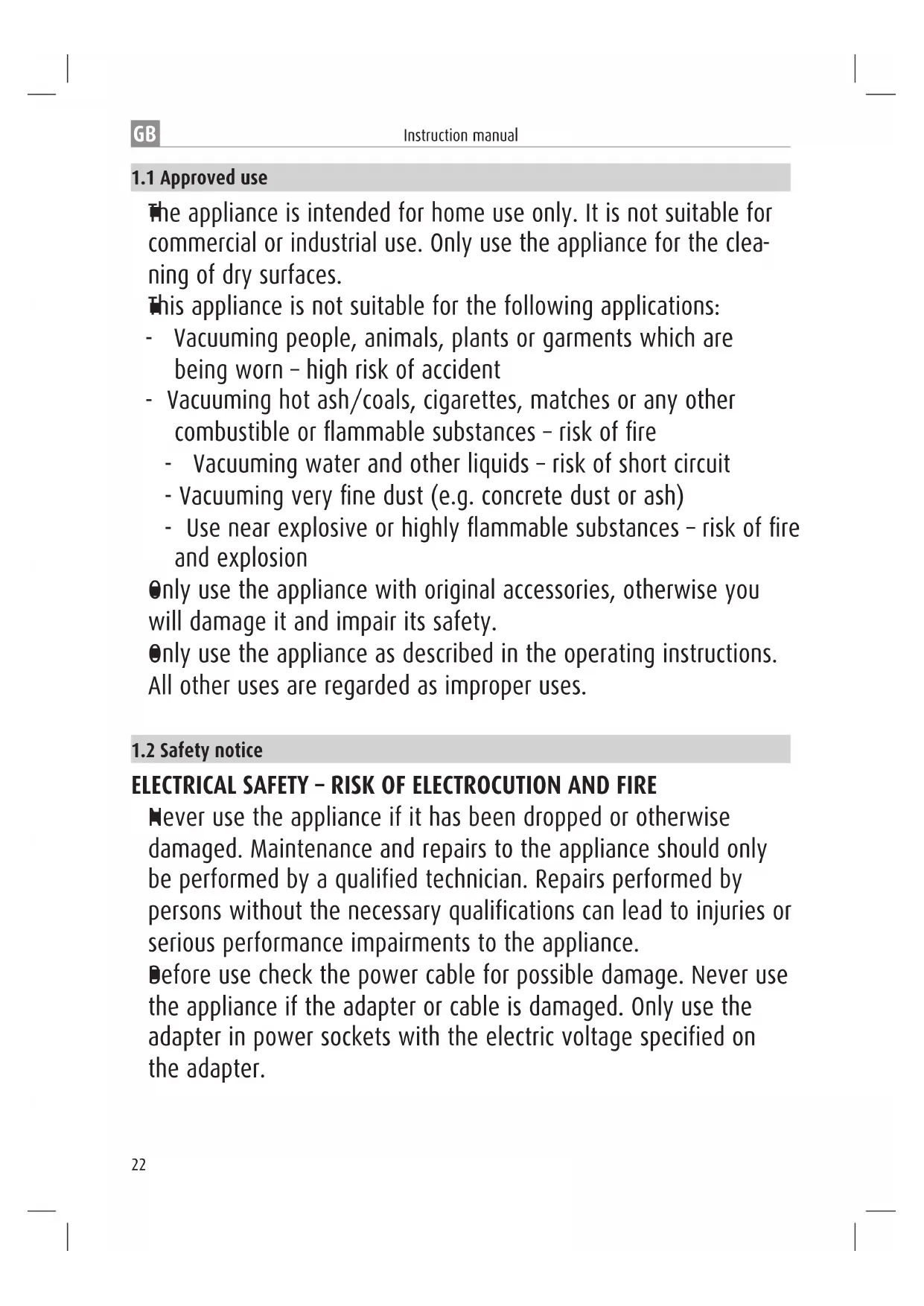 Before use check the power cable for possible damage. Never use the appliance if the adapter or cable is damaged. Only use the adapter in power sockets with the electric voltage specified on the adapter.23 Instruction manual
