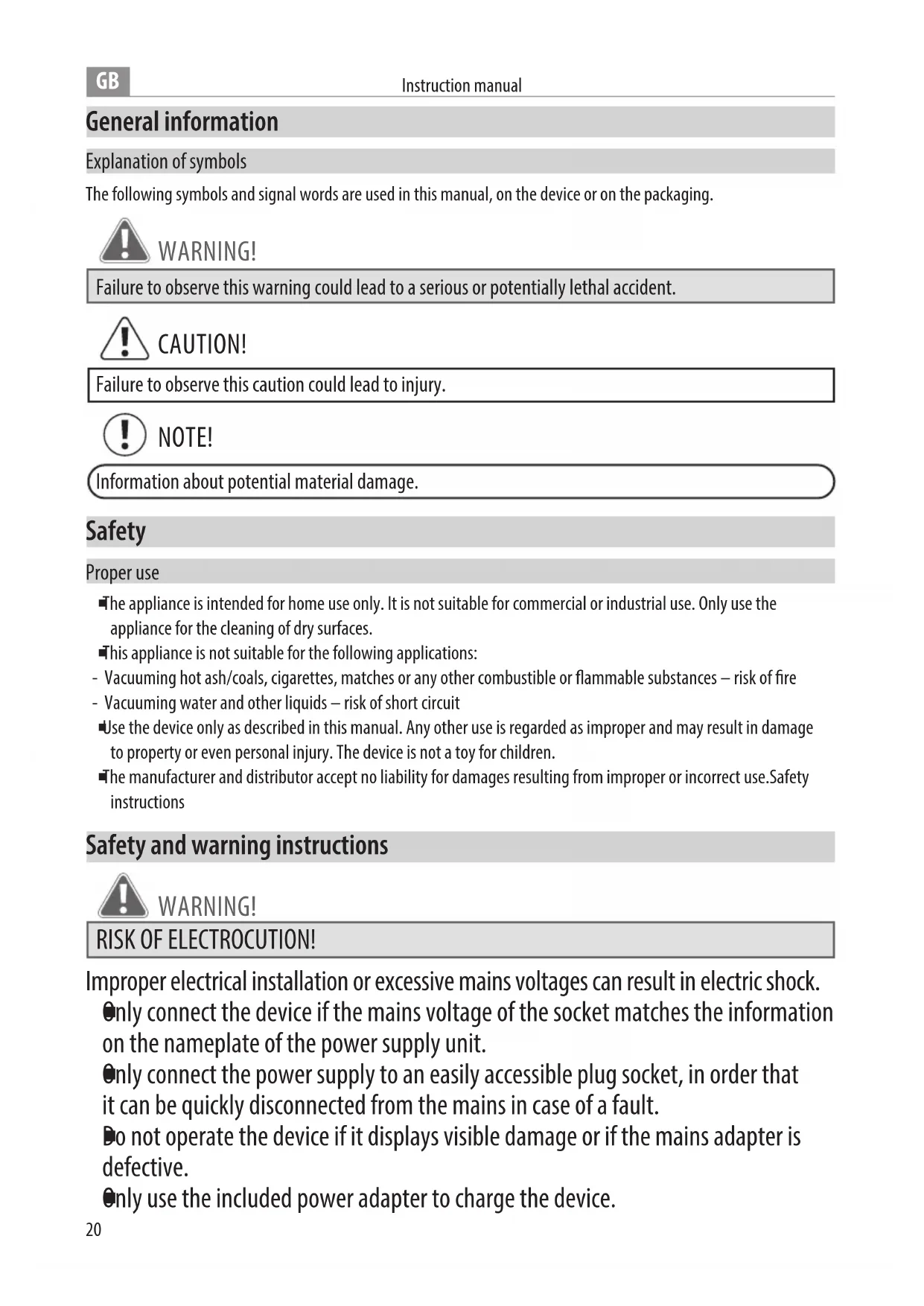 Instruction manual General information Explanation of symbols The following symbols and signal words are used in this manual, on the device or on the packaging. CAUTION! Failure to observe this caution could lead to injury. Safety Proper use The appliance is intended for home use only. It is not suitable for commercial or industrial use. Only use the appliance for the cleaning of dry surfaces. This appliance is not suitable for the following applications: - Vacuuming hot ash/coals, cigarettes, matches or any other combustible or ammable substances – risk of re - Vacuuming water and other liquids – risk of short circuit Use the device only as described in this manual. Any other use is regarded as improper and may result in damage to property or even personal injury. The device is not a toy for children. The manufacturer and distributor accept no liability for damages resulting from improper or incorrect use.Safety instructions Safety and warning instructions WARNING! RISK OF ELECTROCUTION! Improper electrical installation or excessive mains voltages can result in electric shock.