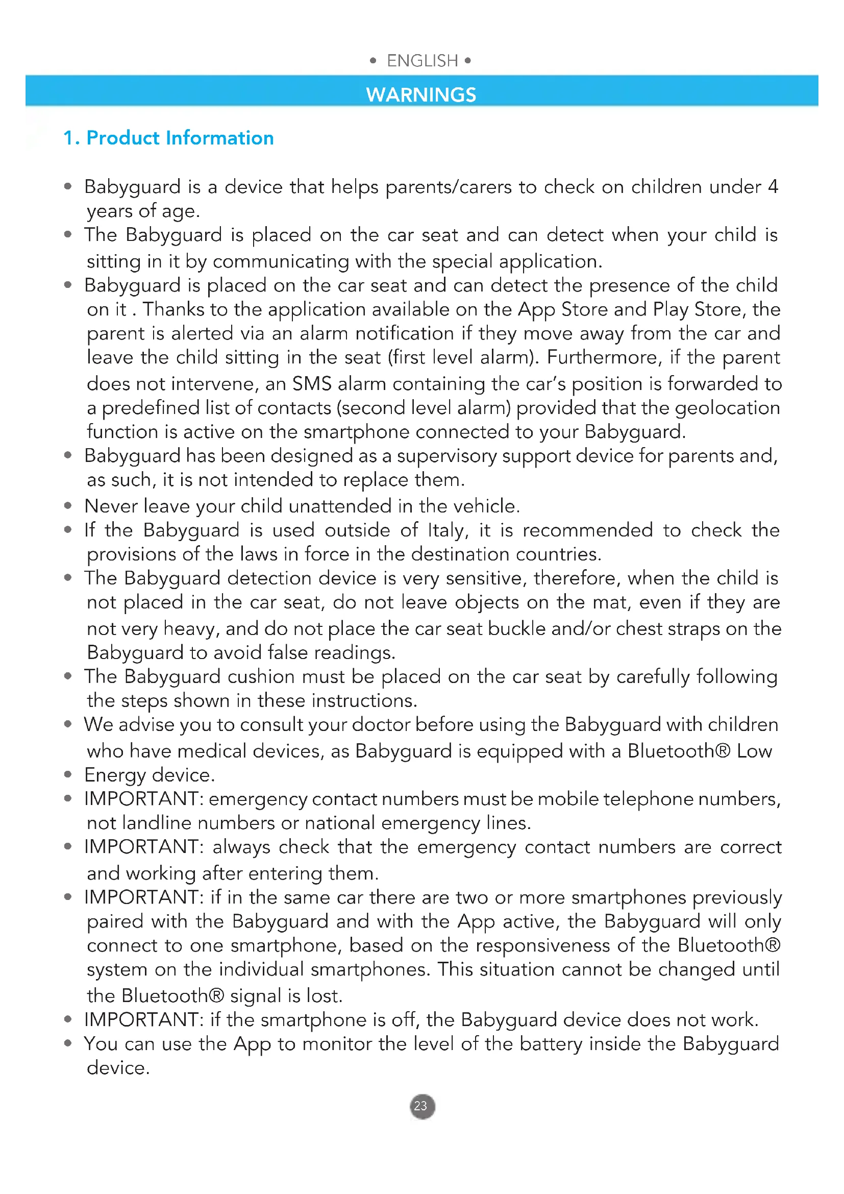 - IMPORTANT: if in the same car there are two or more smartphones previously paired with the Babyguard and with the App active, the Babyguard will only connect to one smartphone, based on the responsiveness of the Bluetooth® system on the individual smartphones. This situation cannot be changed until the Bluetooth® signal is lost.