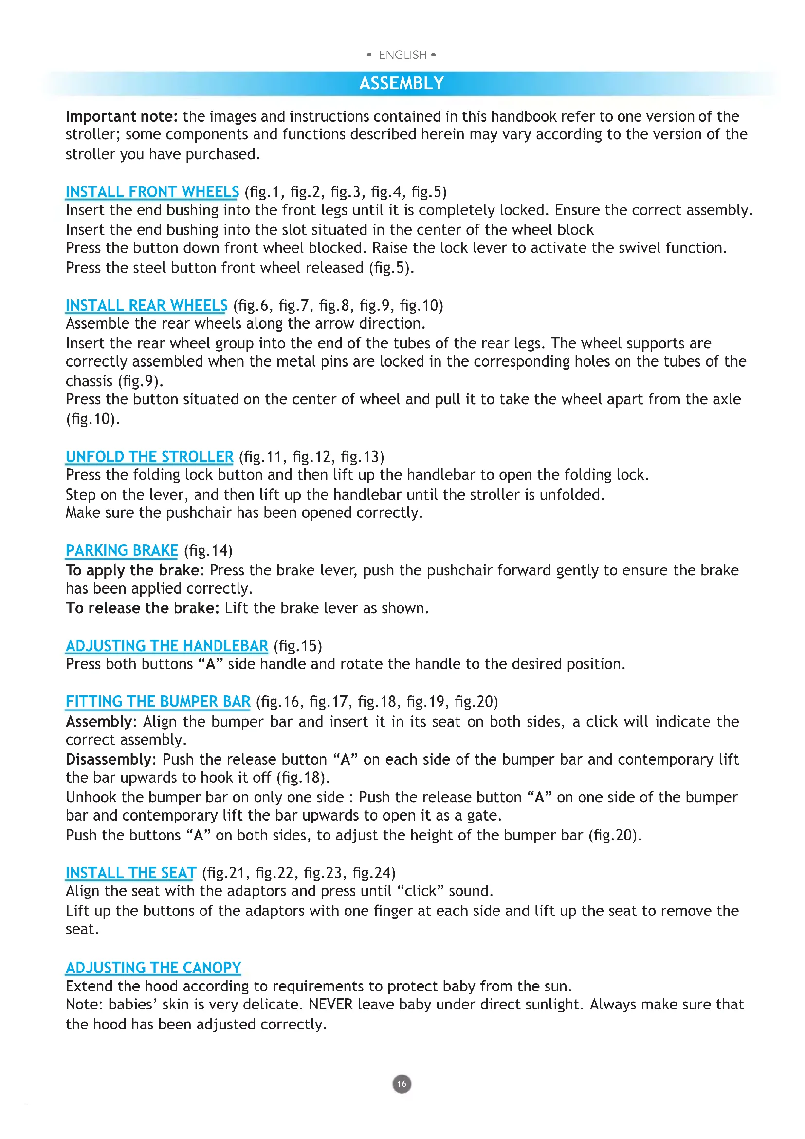 - ENGLISH • • ENGLISH • ASSEMBLY Important note: the images and instructions contained in this handbook refer to one version of the stroller; some components and functions described herein may vary according to the version of the stroller you have purchased. INSTALL FRONT WHEELS (g.1, g.2, g.3, g.4, g.5) Insert the end bushing into the front legs until it is completely locked. Ensure the correct assembly. Insert the end bushing into the slot situated in the center of the wheel block Press the button down front wheel blocked. Raise the lock lever to activate the swivel function. Press the steel button front wheel released (g.5). INSTALL REAR WHEELS (g.6, g.7, g.8, g.9, g.10) Assemble the rear wheels along the arrow direction. Insert the rear wheel group into the end of the tubes of the rear legs. The wheel supports are correctly assembled when the metal pins are locked in the corresponding holes on the tubes of the chassis (g.9). Press the button situated on the center of wheel and pull it to take the wheel apart from the axle (g.10). UNFOLD THE STROLLER (g.11, g.12, g.13) Press the folding lock button and then lift up the handlebar to open the folding lock. Step on the lever, and then lift up the handlebar until the stroller is unfolded. Make sure the pushchair has been opened correctly. PARKING BRAKE (g.14) To apply the brake: Press the brake lever, push the pushchair forward gently to ensure the brake has been applied correctly. To release the brake: Lift the brake lever as shown. ADJUSTING THE HANDLEBAR (g.15) Press both buttons “A” side handle and rotate the handle to the desired position. FITTING THE BUMPER BAR (g.16, g.17, g.18, g.19, g.20) Assembly: Align the bumper bar and insert it in its seat on both sides, a click will indicate the correct assembly. Disassembly: Push the release button “A” on each side of the bumper bar and contemporary lift the bar upwards to hook it o (g.18). Unhook the bumper bar on only one side : Push the release button “A” on one side of the bumper bar and contemporary lift the bar upwards to open it as a gate. Push the buttons “A” on both sides, to adjust the height of the bumper bar (g.20). INSTALL THE SEAT (g.21, g.22, g.23, g.24) Align the seat with the adaptors and press until “click” sound. Lift up the buttons of the adaptors with one nger at each side and lift up the seat to remove the seat.