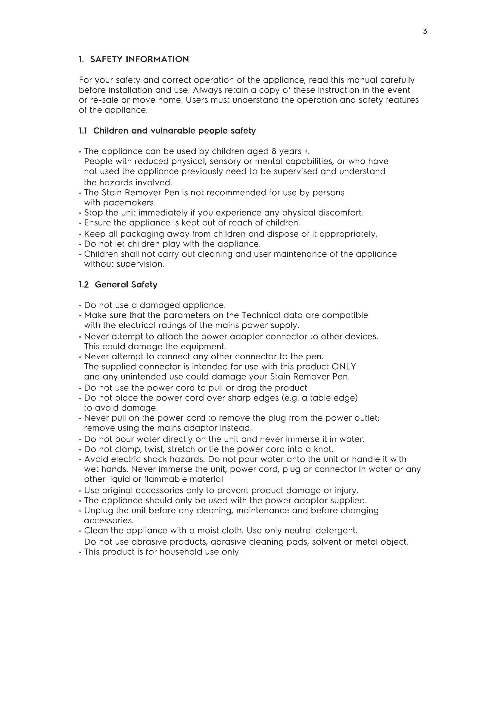 Remover Pen. CAUTION! The Stain Remover Pen will operate continuously for 5 minutes before it is switched off to allow the tip to cool. After 4 and a half minutes of use, the wand tip will begin to flash to indicate its maximum cycle time has nearly been reached. After a 1 minute pause, the wand can again be used normally. CAUTION! Use only neutral and colourless liquid laundry detergent, which is chlorine-free. Never use coloured detergents or fabric softeners, as they can stain the fabric. CAUTION! This product is designed to remove stains up to 3 cm (about 1 inch) in diameter. It is not suitable for use on old stains or stains from chlorine bleaches, mustard, non-removable inks, solvents and other chemicals causing permanent damage. CAUTION! If the care label on your clothes says "wash separately" or "wash with similar colors", that usually means that the dye isn't stable and is going to bleed or even rub off. You should wash your garment at least 3 times according to the care label before to apply the Stain Remover Pen to avoid a possible halo effect on unwashed dyed clothes. On darker fabrics reduce the application time.6
