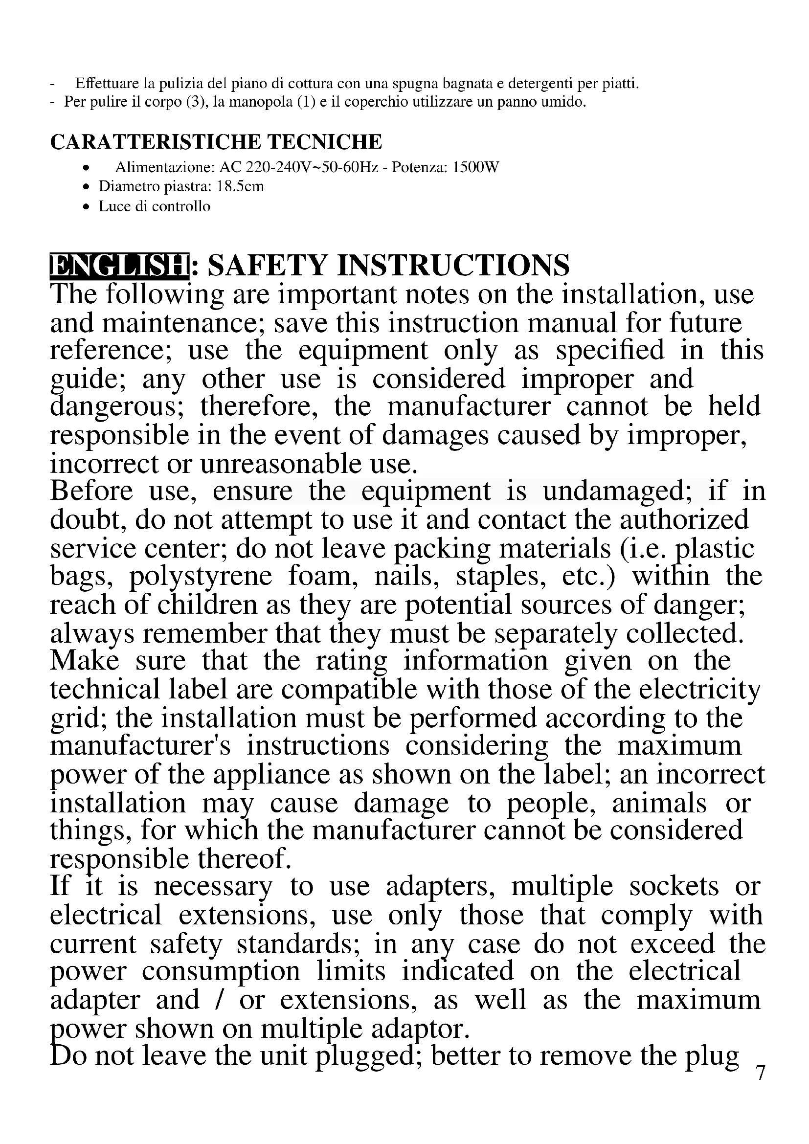 CLEANING Unplug the unit from the electrical outlet and allow the complete cooling down of each part before starting the cleaning operations. - Do not immerse the unit in water; do not leave it under the stream of tap water. In any case, avoid water or other liquids sliding on the cooking surfaces. - Do not use scouring or metal pads for cleaning the plates. - Clean the cooking plate with a damp sponge and dishwashing detergents. - Clean the main body (3), the knob (1) and the cover with a damp cloth.11 TECHNICAL FEATURES
