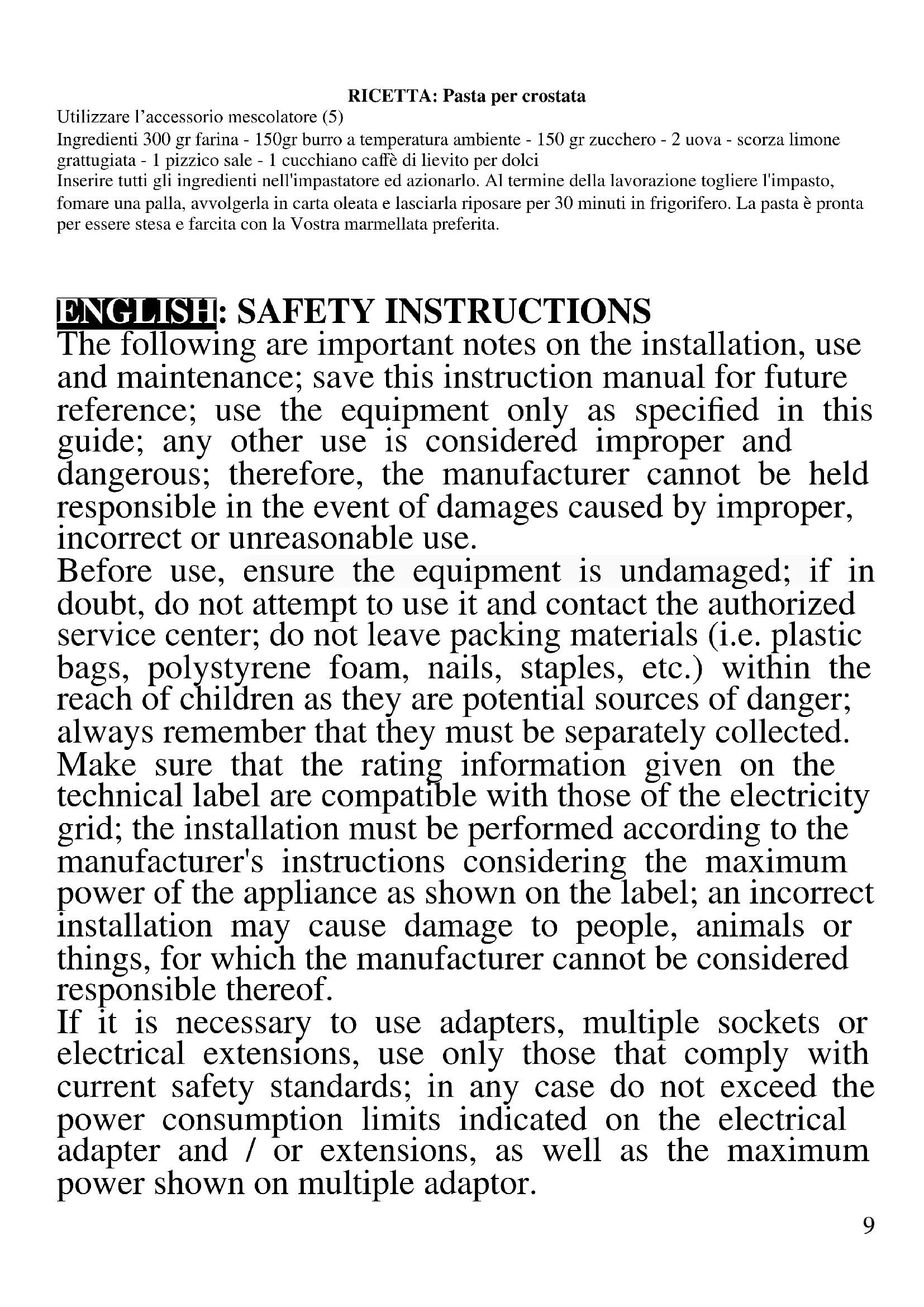 The following are important notes on the installation, use and maintenance; save this instruction manual for future reference; use the equipment only as specified in this guide; any other use is considered improper and dangerous; therefore, the manufacturer cannot be held responsible in the event of damages caused by improper, incorrect or unreasonable use. Before use, ensure the equipment is undamaged; if in doubt, do not attempt to use it and contact the authorized service center; do not leave packing materials (i.e. plastic bags, polystyrene foam, nails, staples, etc.) within the reach of children as they are potential sources of danger; always remember that they must be separately collected. Make sure that the rating information given on the technical label are compatible with those of the electricity grid; the installation must be performed according to the manufacturer's instructions considering the maximum power of the appliance as shown on the label; an incorrect installation may cause damage to people, animals or things, for which the manufacturer cannot be considered responsible thereof. If it is necessary to use adapters, multiple sockets or electrical extensions, use only those that comply with current safety standards; in any case do not exceed the power consumption limits indicated on the electrical adapter and / or extensions, as well as the maximum power shown on multiple adaptor.10 Do not leave the unit plugged; better to remove the plug from the mains when the device is not in use. Always disconnect from power supply if you leave it unattended. Cleaning operations should be carried out after unplugging the unit. If the unit is out of order and you do not want to fix it, it must be made inoperable by cutting power cord. - Do not allow the power cord to get closer to sharp objects or in contact with hot surfaces; do not pull it to disconnect the plug. - Do not use the appliance in the event of damage to the power cord, plug, or in case of short circuits; to repair the product only address an authorized service center. - Do not handle or touch the appliance with wet hands or bare feet. Do not expose the appliance to harmful weather conditions such as rain, moisture, frost, etc.. Always store it in a dry place. - This appliance cannot be used by children, even if they're more than 8 years old. - Children must not play with the appliance. - This appliance can be used by persons with reduced physical, sensory or mental capabilities or lack of experience and knowledge if they received supervision or instruction concerning use of appliance in a safe way and understand the hazards involved. - Keep the appliance and its cord out of reach of children less than 8 years. If the power cord is damaged, or in case of failure and / or malfunction do not tamper with the unit. The reparation must be done by manufacturer or by service center authorized by the manufacturer in order to prevent any risk. Failure to comply with the above may compromise the unit safety and invalidate the warranty. - This appliance is intended to be used in household and similar applications such as: staff kitchen areas in shops,11 offices and other working environments; by clients in hotels, motels and other residential type environments; farm houses, bed and breakfast type environments. - The appliance is not intended to be operated by means of an external timer or separate remote-control system. - Before every use, unroll the power cord. - Use original spare parts and accessories only. - Do not subject the product to strong impacts, serious damages may result. - Do not use near or under flammable materials (like curtains), heat, cold spots and steam. GENERAL INFORMATION - Before first use, wash carefully the parts in touch with food: container, cover and accessories. - To avoid the overheating of the engine does not use the appliance running continuously for more than 20 minutes; in this case interval with at least 10 minutes of rest. Do not use without food inside the container. - Do not put your fingers inside the container of food while the unit is operating. Keep hair and clothing away from moving parts. Do not insert objects or ingredients while the machine is running. - Place the unit on a flat, stable and not slippery surface. - Bring knob on "0" (OFF) position before inserting the plug in the socket. - Before operating, check that the parts are assembled correctly. Before connecting the plug, mount the proper accessory. - Before removing the accessories always turn off the unit. Clean the accessories after each use. - The use of non-original accessories may damage the unit and invalidate the warranty. - Never leave the appliance unattended while it is running. - Disconnect plug from electrical outlet after use and12 before install or remove any accessory. - Do not immerse the main unit in water or other liquids; clean it with a damp cloth. WARNING!!! Do not overload appliance. Total weight of ingredients in the container cannot be over 4 Kg, in case of soft dough, or 3 Kg, in case of hard pastes like pizza, or 2.5 Kg for fresh made pasta. - When using pasta, fettuccine or spaghetti maker, do not insert fingers or hair or clothes on the reels. - When using the meat grinder, use only the specific accessory to press food inside the feeding tube. WARNING!!! Do not use the appliance as kneading machine and with one of the optional accessories at the same time. This may result in damage due to overload. DESCRIPTION G20113